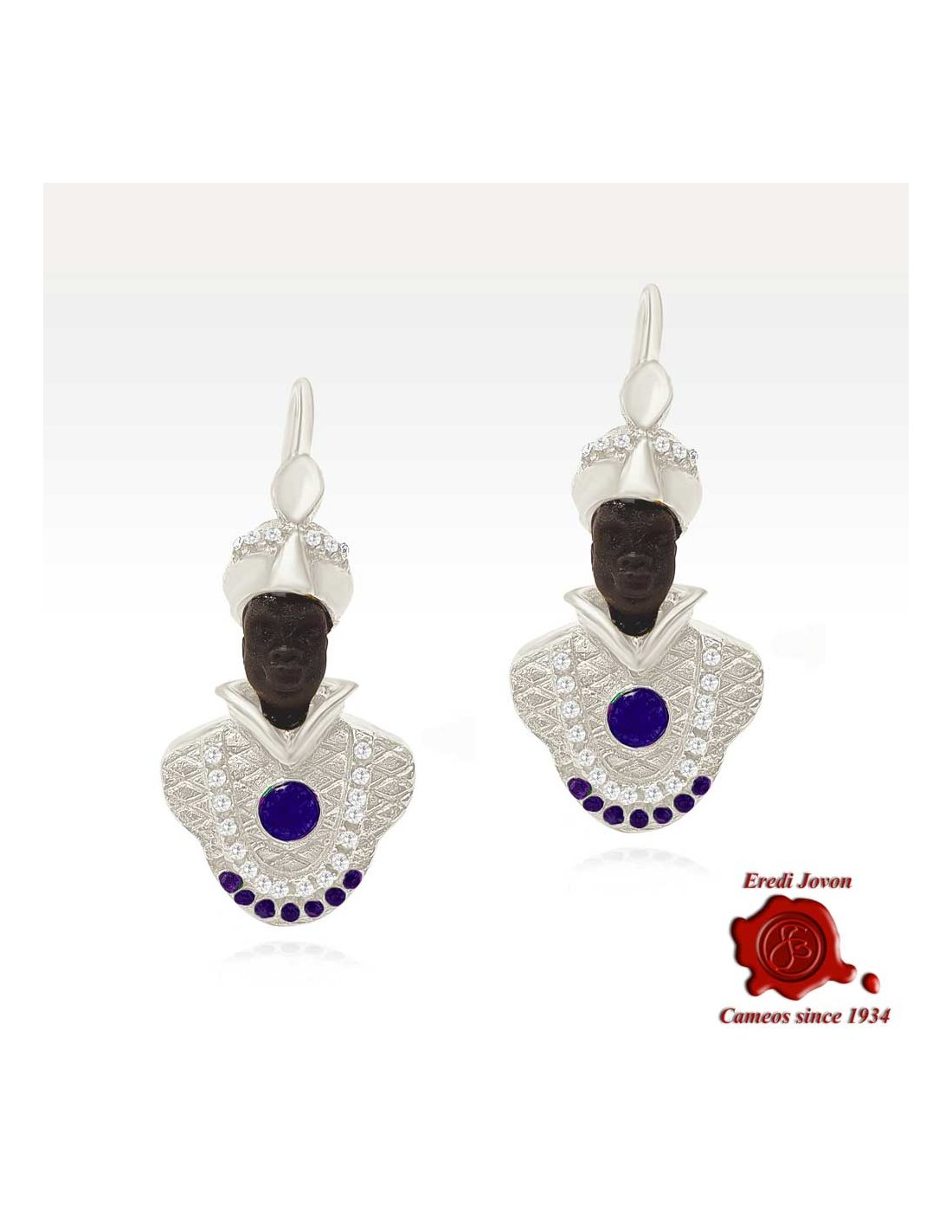 Venetian Nocturne Moor earrings - This pair of “Notturno Veneziano” earrings, crafted with impeccable precision, are true artisanal masterpieces that embody the passion and art of those who created them and carry with them the magic and history of Venice. Finely crafted silver combines with dark blue sapphires, creating a jewel that emanates an intense and deep light, full of charm and mystery. At the center, the figure of the Moretto, an iconic symbol of the Serenissima, an authentic testimony of a period in which Venice, a crossroads of cultures and trade, shone as the capital of art and discoveries from the East. With a secure and refined leverback closure, these earrings become a unique piece to wear, perfect for those who love to surround themselves with elegance and tradition.