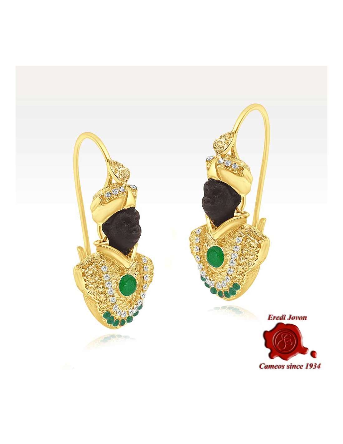 Lagoon Breeze Blackamoor earrings - This pair of “Vento di Laguna” earrings captures the charm of the Venetian lagoon. The emeralds, with their deep and enveloping green, are masterfully combined with Venetian goldsmith art, giving life to a piece that exudes elegance and sophistication. The Moretto, finely chiseled, celebrates the goldsmith art of Venice, becoming a symbol of refinement and tradition that has been handed down for generations. The genuine emeralds, with their intense shades, evoke the green reflections of the lagoon water at sunset. Elegant and bold, this jewel combines refinement and personality, perfect for those who want to carry the vibrant soul of Venice with them, every day. An expression of artisanal quality, tradition and timeless charm.