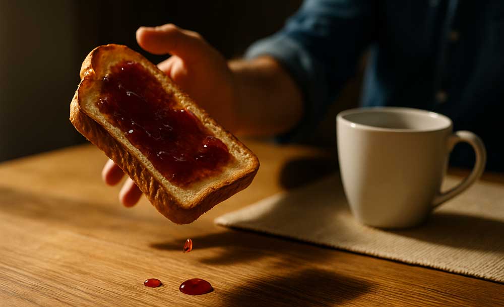 You’ve prepared it with love: golden brown bread, jam spread to perfection. You sit, ready to savor that masterpiece. First bite and… slap! It falls – of course – jam-side down. And you rush to clean it up before the floor turns sticky like a summer swamp.