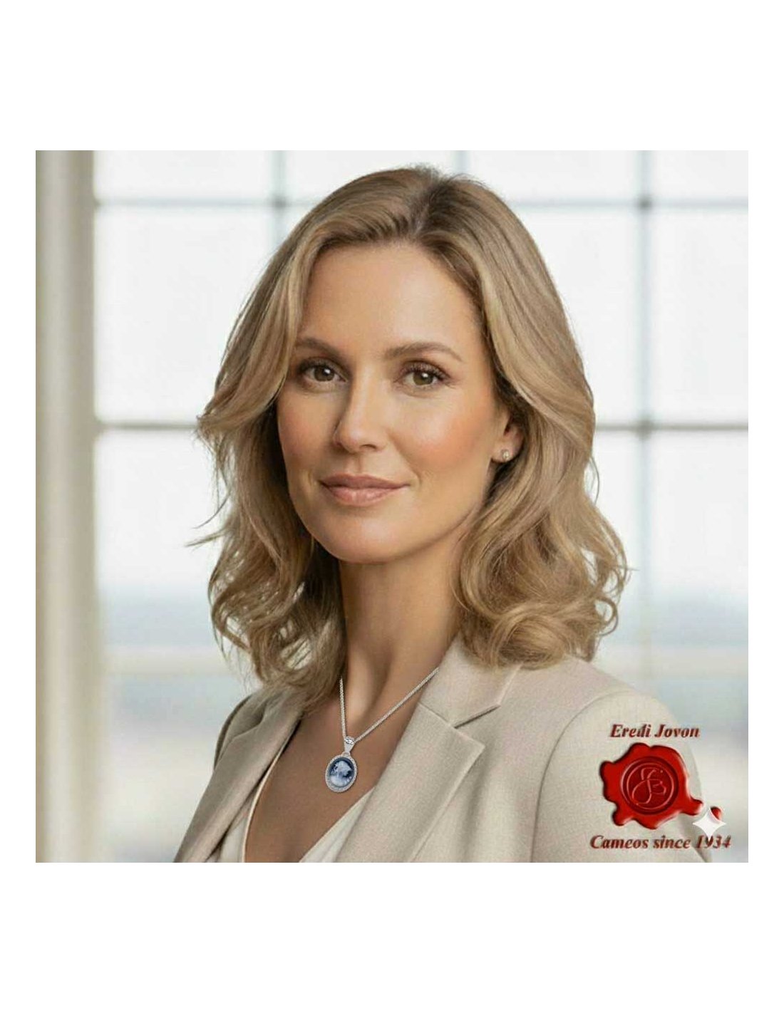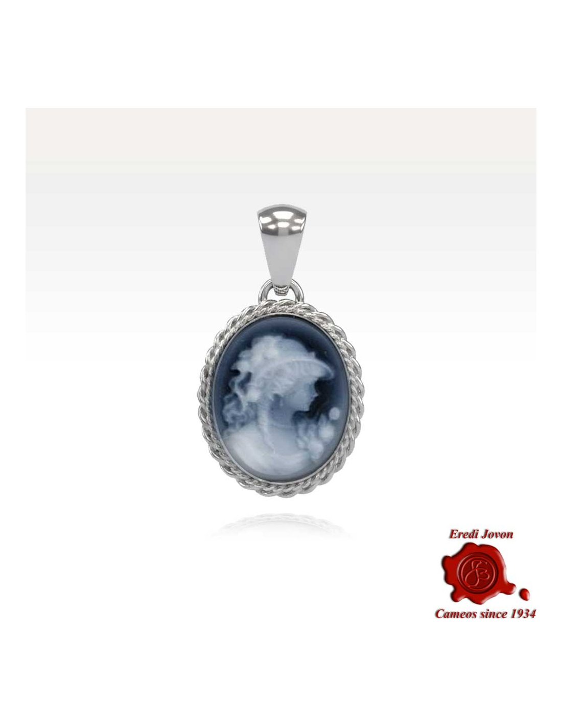Angelica, 12 mm. Refined cameo hand-engraved on first-quality blue agate, depicting Angelica, the eternal symbol of grace and purity, surrounded by a delicate garden of flowers. The 925 sterling silver setting enhances the natural tones of the stone and brings light to the finely carved face, a true expression of Italian craftsmanship and artistry.
