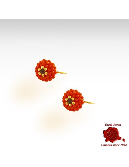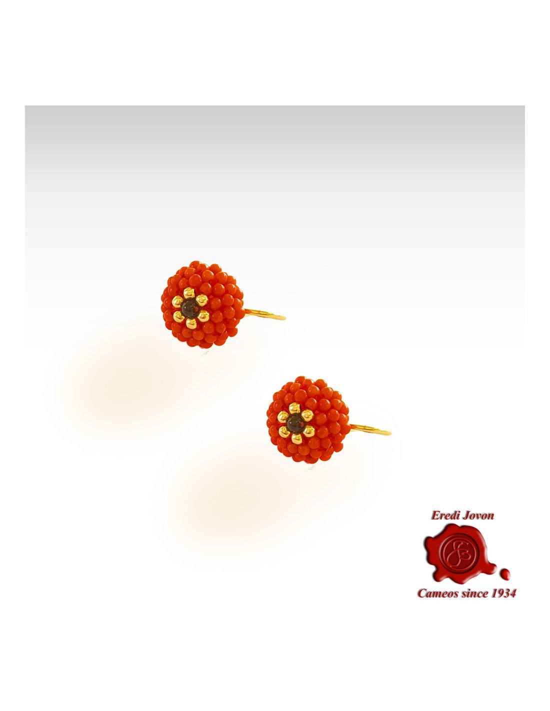 Red Coral "Blackberry" silver gold plated earrings with "tessito" work - Genuine first choice mediterranean coral and onyx earrings, with an unusual work called "tessito". The frame is in sterling silver covered with gold. A touch of elegance you should indulge everyday. They match with an elegant dress or with your jeans: perfect for everyday use!
