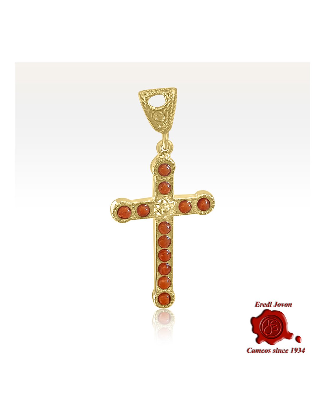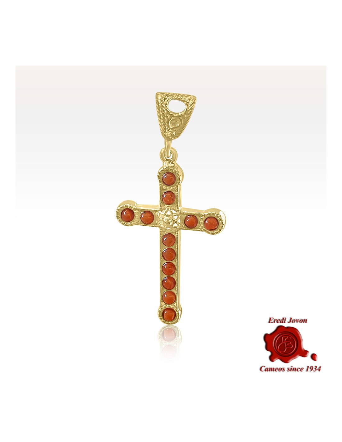 Vintage Red Coral Cross - The combination of the cross charm with red coral and red gold creates an exquisite and symbolic piece of jewelry. The vibrant red color of the coral beautifully complements the warm hue of the red gold, enhancing the elegance of the charm. This captivating design seamlessly merges spirituality with fashion, making it an ideal choice for those seeking a stylish expression of faith.