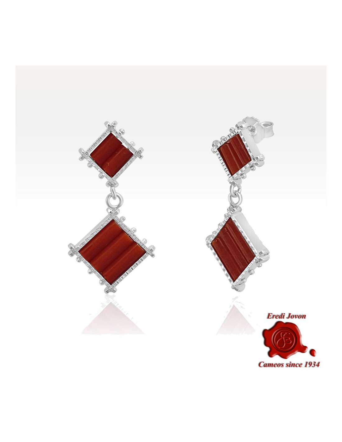 Diamond-Shaped Red Coral Earrings set in Silver - This elegant set of diamond-shaped red coral earrings, encased in shiny silver, are a perfect combination of style and sophistication, designed for those looking for an accessory that combines tradition and contemporary style. The teardrop silhouette gives a touch of refined movement and an unmistakable lightness, making them suitable for any time of day, from day to night, thanks to their versatility and sophistication. The rich shade of red coral, a symbol of strength and passion, adds a touch of unparalleled intensity and beauty to this jewel and the shiny silver creates a fascinating and sophisticated contrast. Crafted with care and mastery, these earrings are a unique and original piece of Made in Italy.