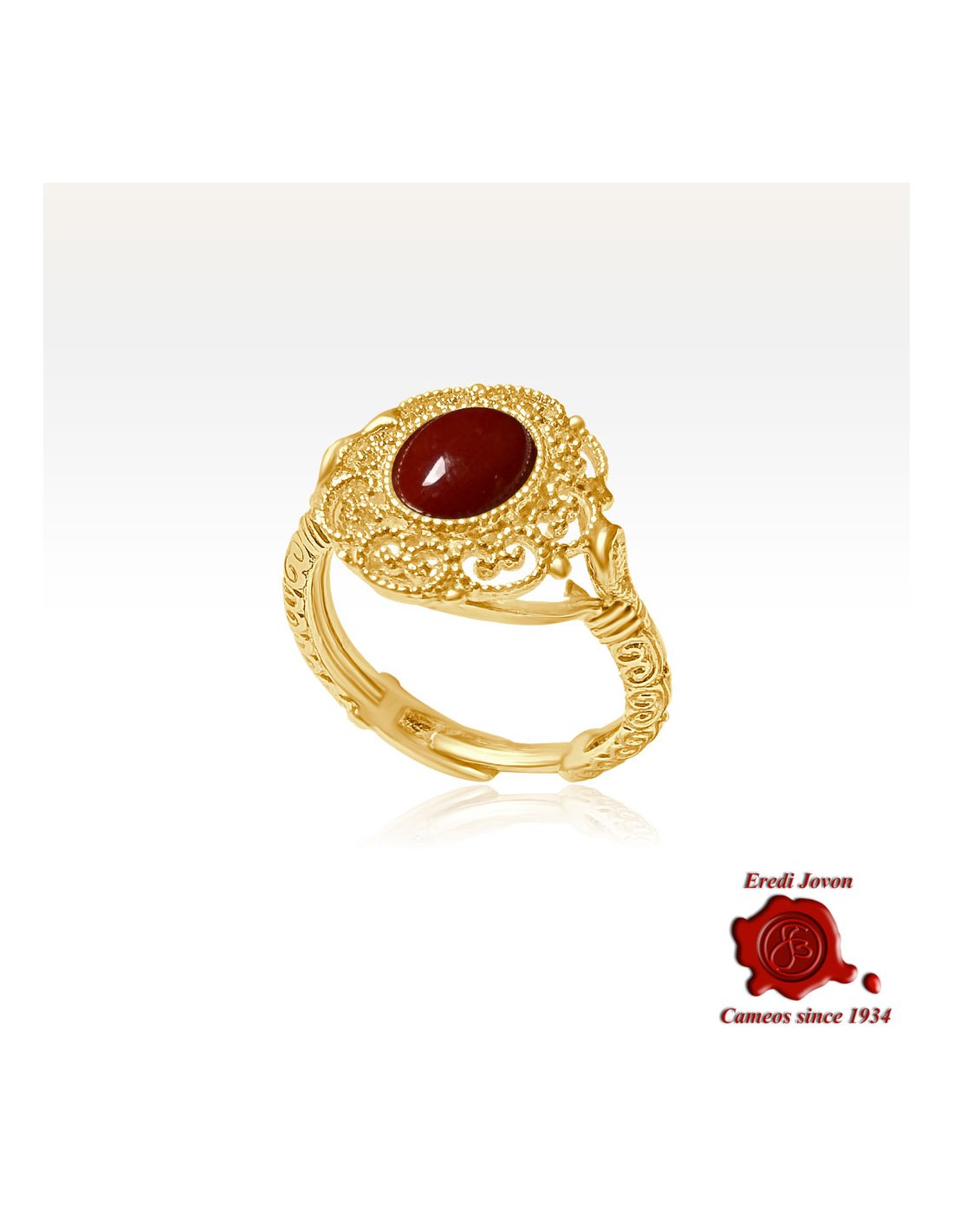 Description: From the Eredi Jovon workshop comes a jewel that tells the story of Venice through its most precious art: goldsmithing. Every curve, every detail, every sparkle reflects the passion of those who transform metal into poetry. A timeless masterpiece by Eredi Jovon, an emblem of style and mastery since 1934: a Golden Red Coral Filigree Ring. A symbol of style and harmony, designed for those who love to carry a fragment of Venice within them. The metal, patiently chiseled, forms harmonious designs that embrace Mediterranean coral, a living and vibrant stone, a symbol of energy, passion, and protection. Its intense hue glows in the light, recalling lagoon sunsets and the fire that burns in the hearts of those who love authentic beauty.