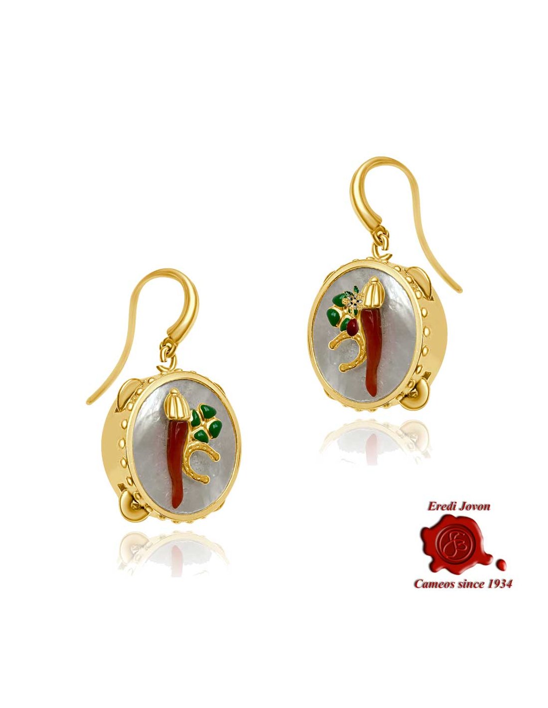 Description: Eredi Jovon reinterprets the symbols of good luck in a precious creation, where every detail speaks of a wish, a hope, a promise of good luck: the Mother-of-Pearl Lucky Horn, Four-Leaf Clover & Horseshoe Earrings. Each creation is handcrafted according to the ancient Venetian goldsmith art, where the artisan's gesture becomes a ritual and light takes shape. The luminous and iridescent mother-of-pearl serves as the backdrop for three universal symbols of good luck: the red horn, which wards off negative energy; the four-leaf clover, a promise of prosperity and hope; and the horseshoe, a symbol of protection and good fortune.