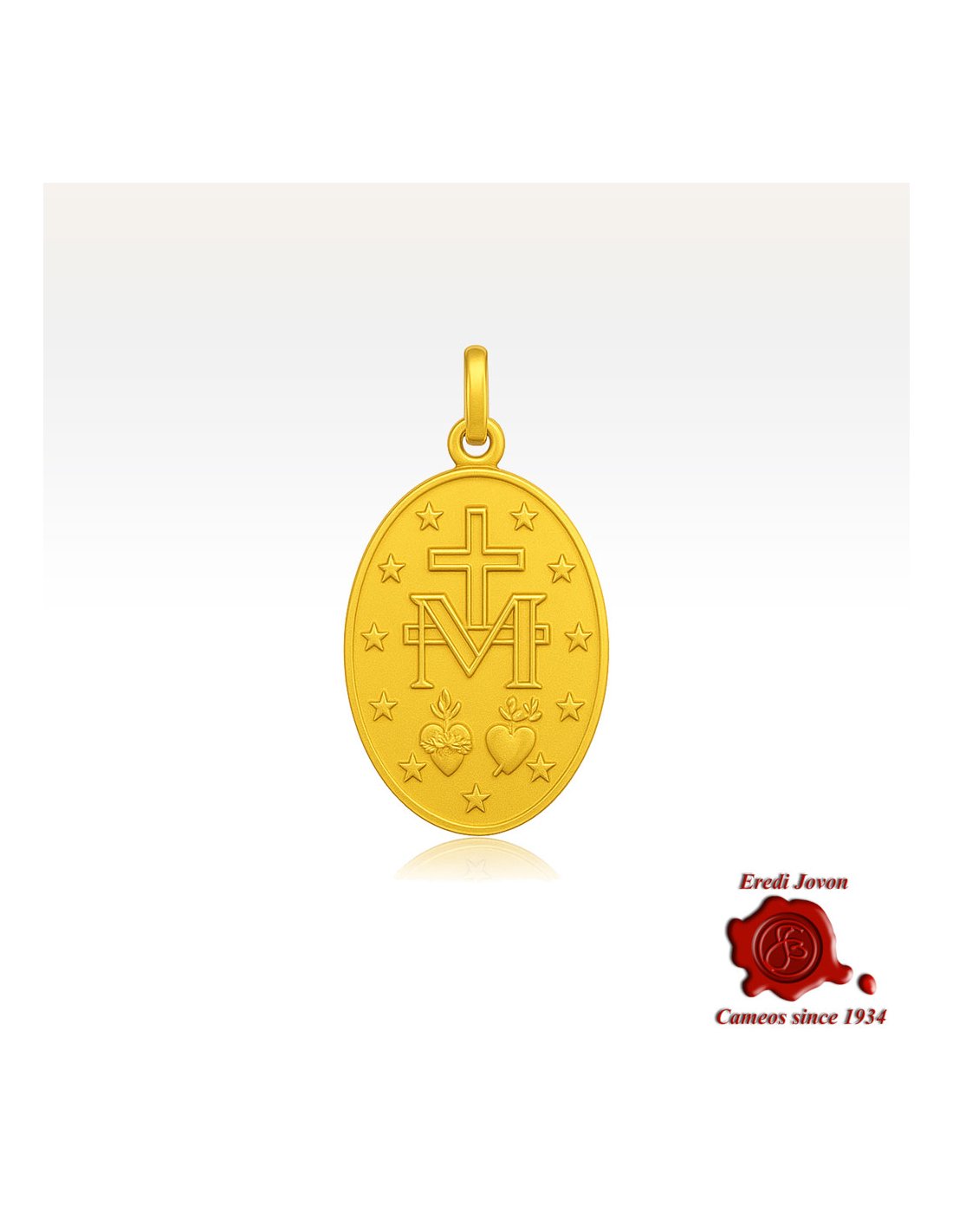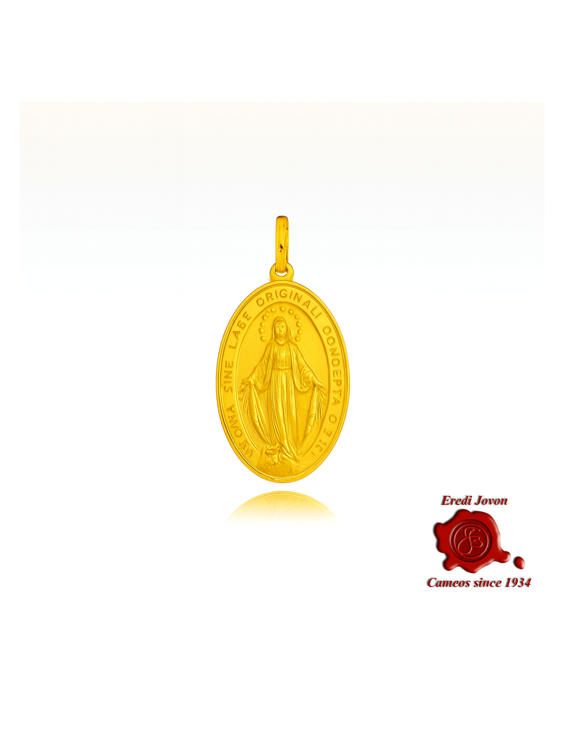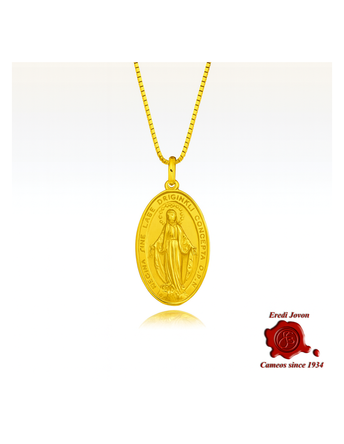 Necklace Included! - the Golden Miraculous Medal Lady of Graces by Eredi Jovon, a symbol of faith, protection, and hope. Known worldwide as the "Medal of Grace," the charm depicts the Virgin Mary spreading her blessing and bears the Latin inscription "Regina Sine Labe Originali Concepta O.P.N." (Regina Sine Labe Originali Concepta O.P.N.), an invocation to Our Lady as spiritual guidance and protection. Handcrafted with expert craftsmanship, this pendant is more than just a jewel of faith; it holds a broader meaning, as well as a sign of devotion to be worn close to the you every day. A precious gift for those seeking a protective amulet or for those who wish to express their faith with a touch of elegance.