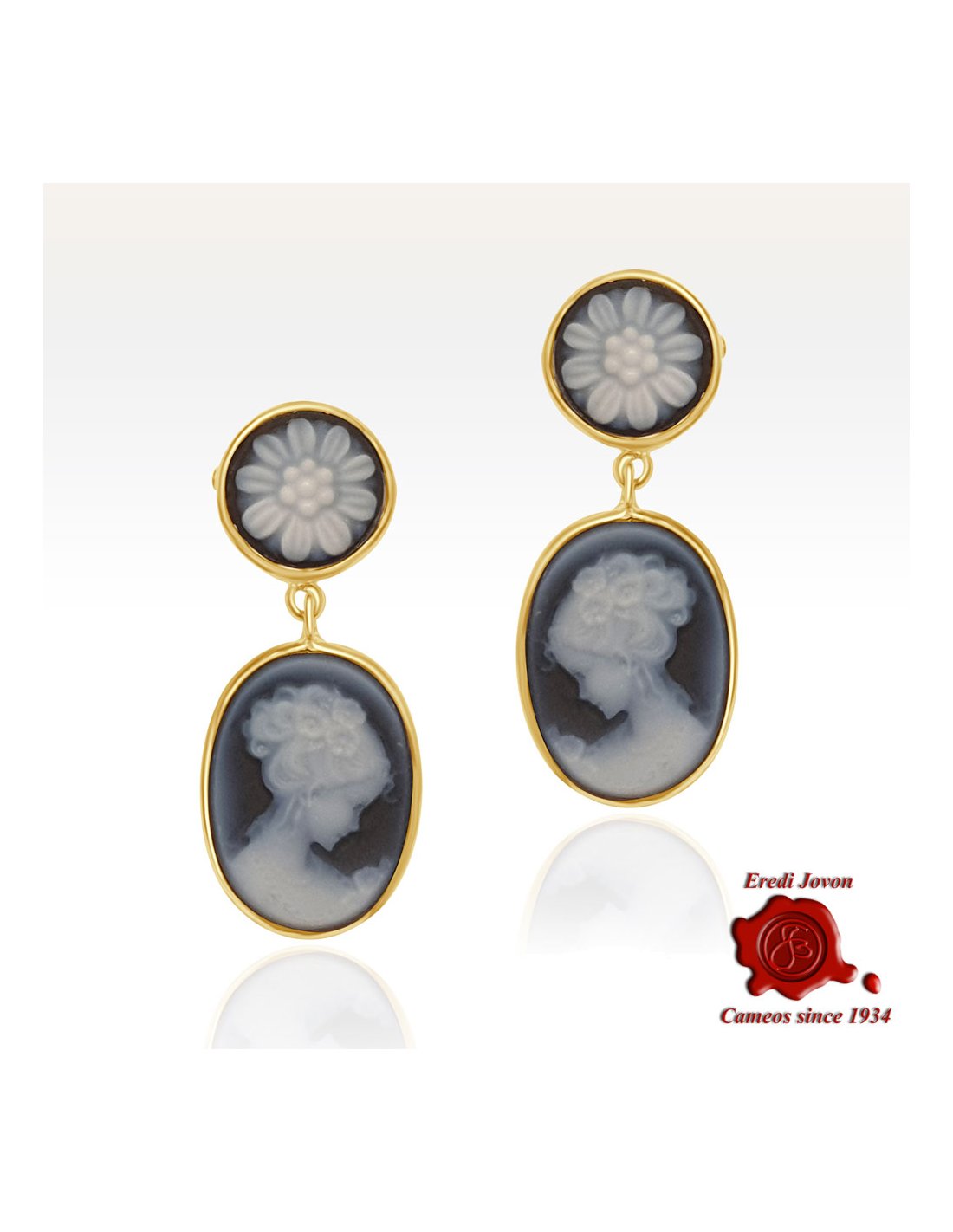 Description: Be enchanted by these exclusive earrings, a perfect combination of classic art and Hollywood glamour without forgetting the unconditional love of Venetians for gardens and flowers. The two cameos, finely hand-carved, depict the figure of Venice, inspired by the famous painting by Tiepolo and an ever-loved daisy. This jewel evokes the unparalleled grandeur of the Serenissima, while paying homage to the glamour of the icons of the 50s and the delicate grace of daisies, emblem of pure love and authentic simplicity. With their shiny yellow gold base, these earrings are an exclusive piece, designed for those who want to add a sophisticated and luminous accent to any outfit.