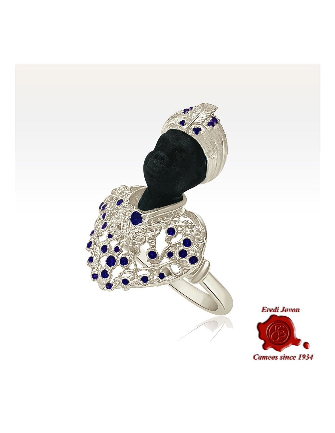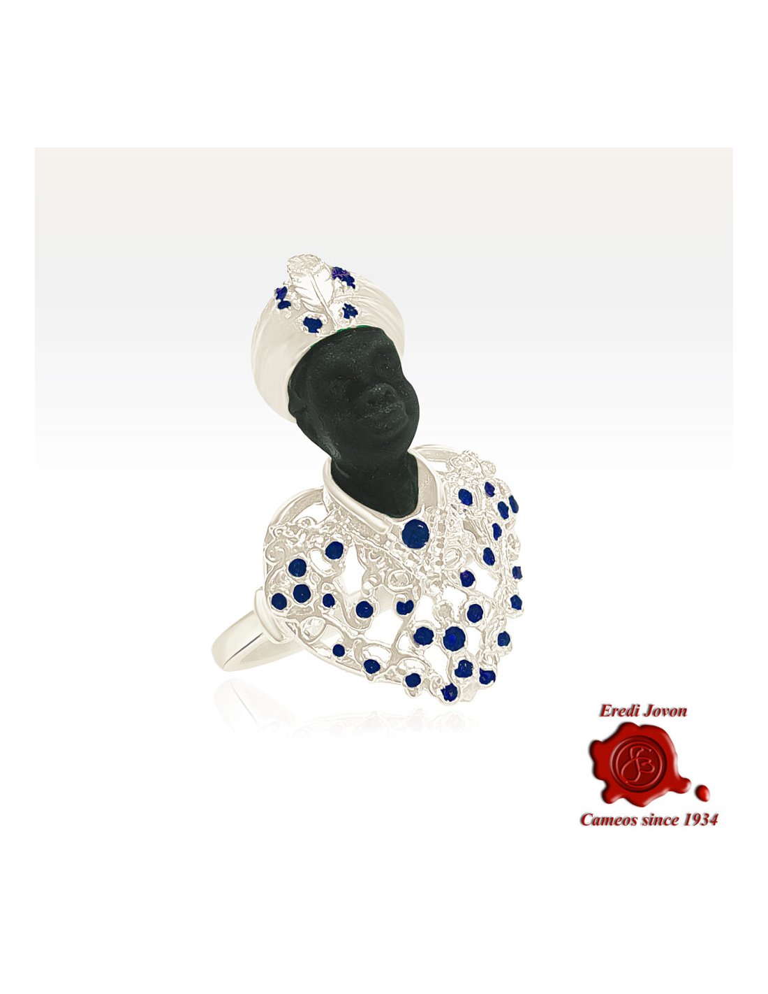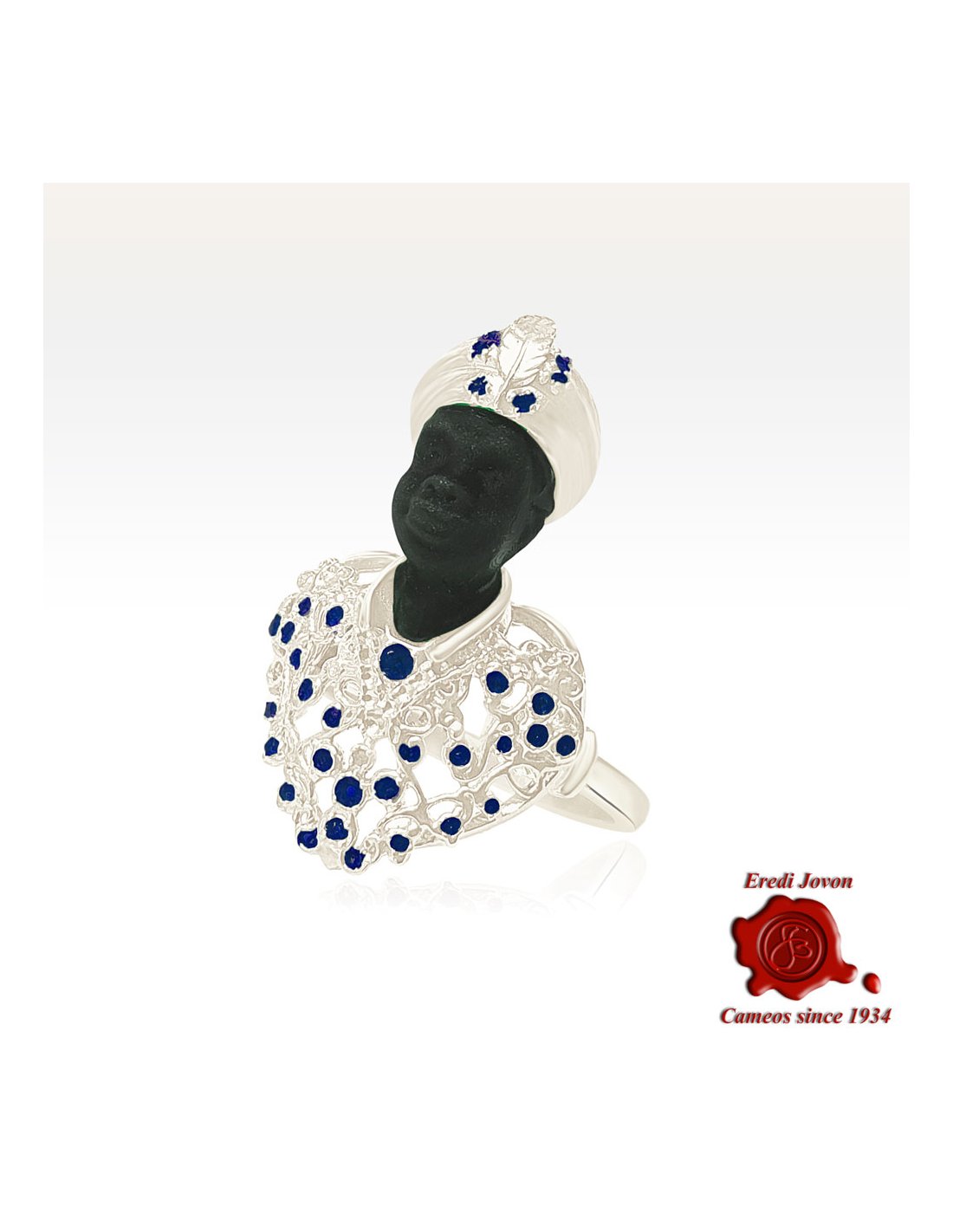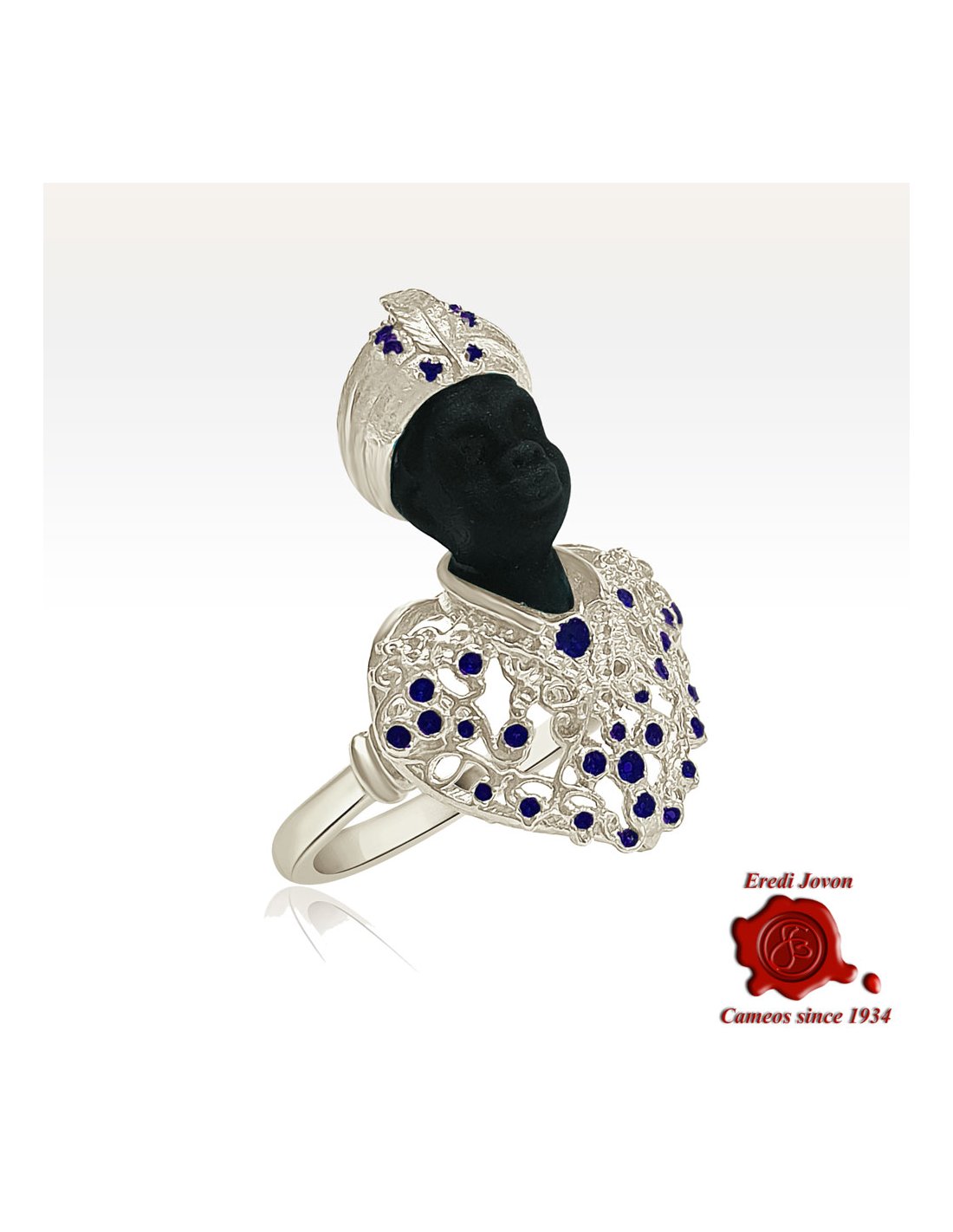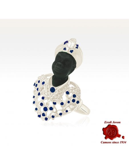 Blackamoor Flame of the Orient - Adjustable Ring, this stunning "Moretto Fiamma d'Oriente" ring embodies the vibrant passion of sapphire, combined with the elegant tranquility of the Venetian moretto, creating a unique fusion of intensity and grace. Elegant in its 925% white silver setting, this jewel is embellished with natural stones, which give the piece a refined shine and an unparalleled charm, creating a harmony that recalls the fascinating exoticism of the Orient. Every aspect of this jewel is meticulously hand-sculpted, celebrating the Venetian tradition with precision and timeless beauty. The photograph, while evocative, cannot fully convey the incredible craftsmanship and brilliance that characterizes this unique ring.The stone are real sapphires!