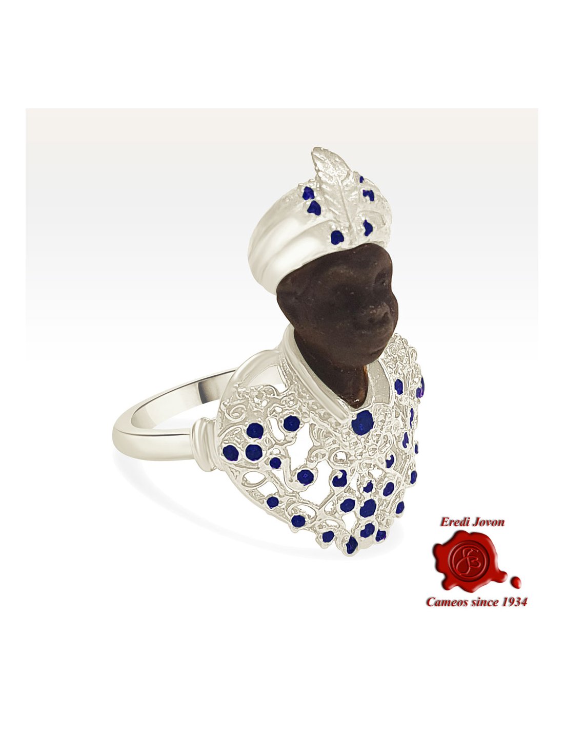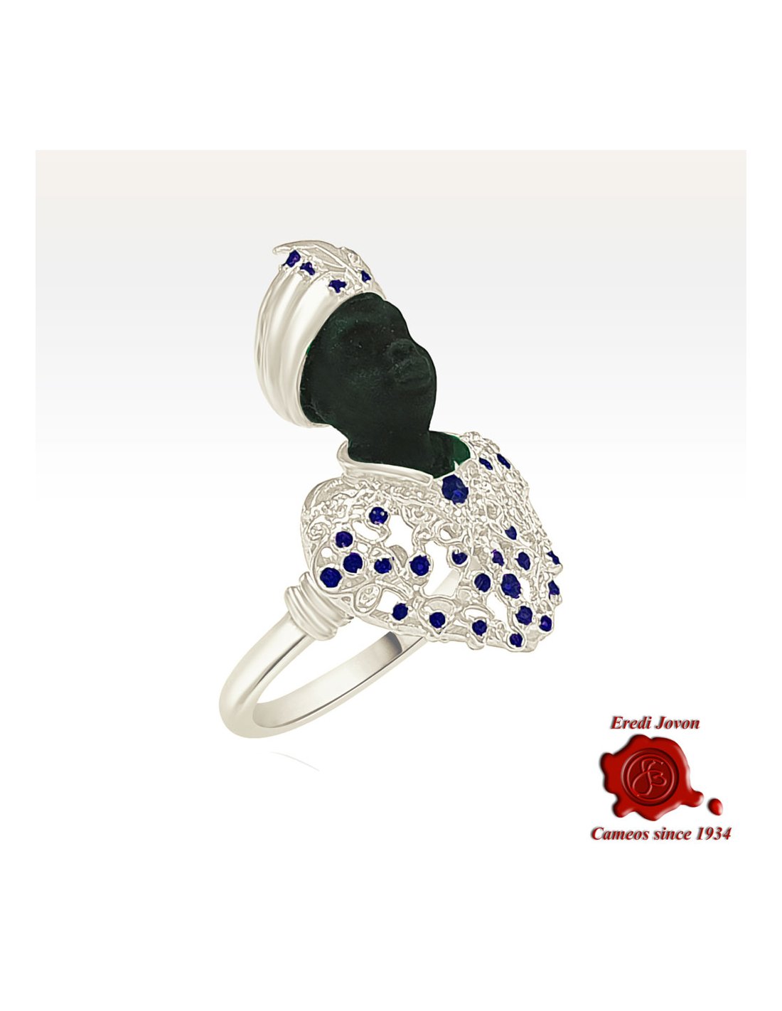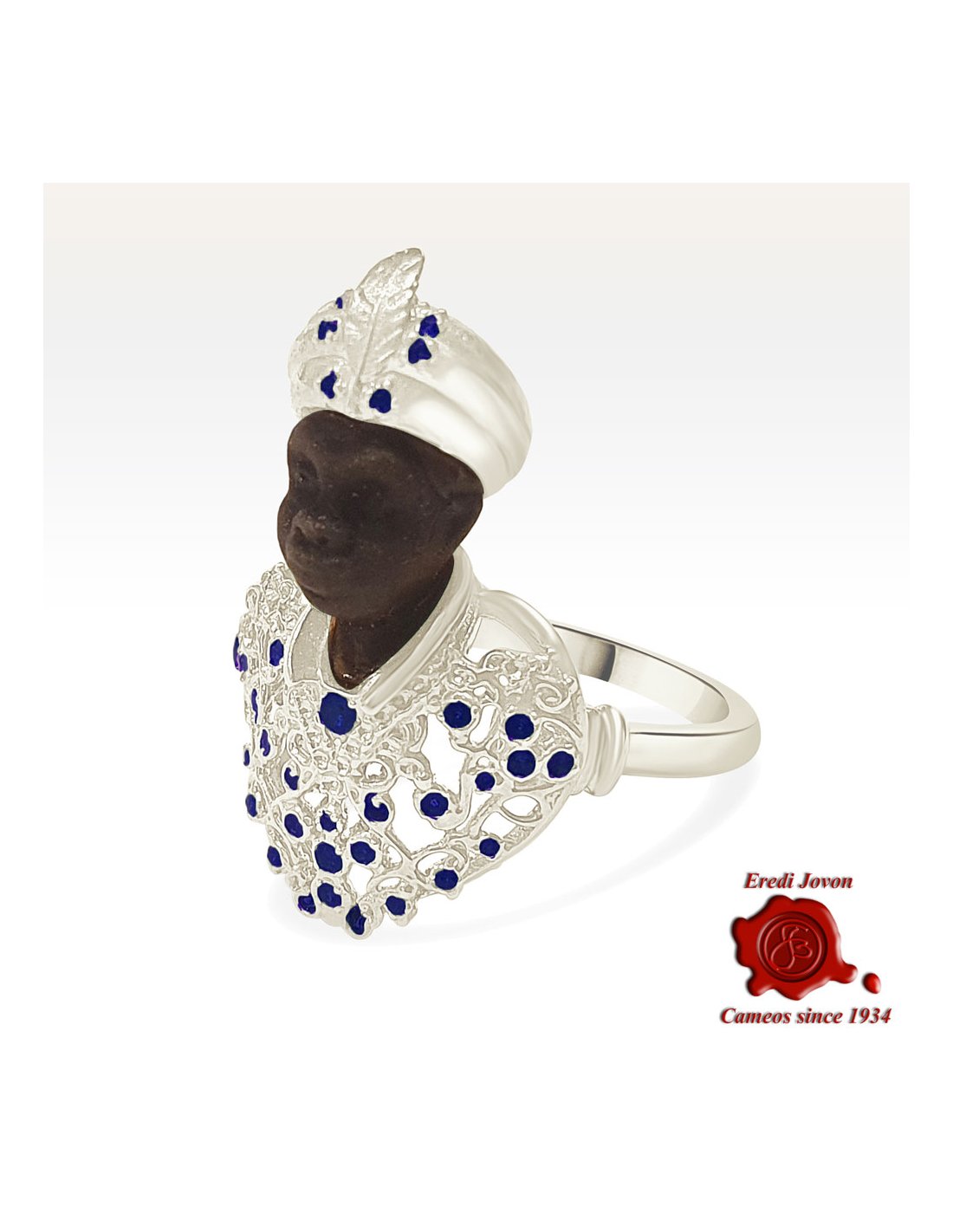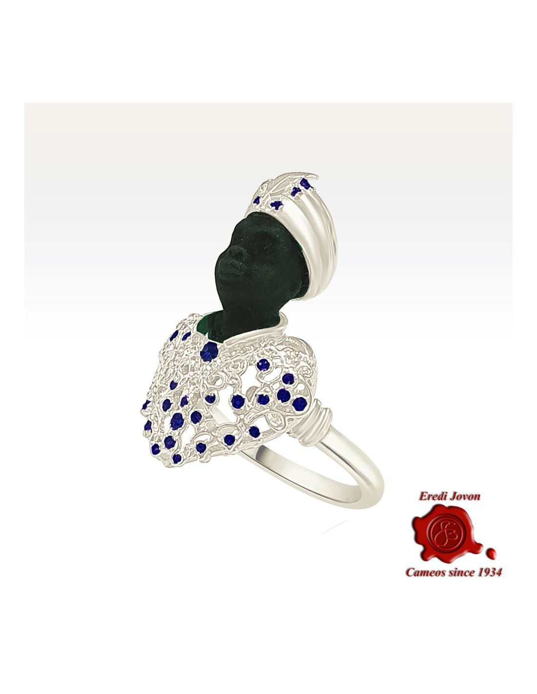 Blackamoor Flame of the Orient - Adjustable Ring, this stunning "Moretto Fiamma d'Oriente" ring embodies the vibrant passion of sapphire, combined with the elegant tranquility of the Venetian moretto, creating a unique fusion of intensity and grace. Elegant in its 925% white silver setting, this jewel is embellished with natural stones, which give the piece a refined shine and an unparalleled charm, creating a harmony that recalls the fascinating exoticism of the Orient. Every aspect of this jewel is meticulously hand-sculpted, celebrating the Venetian tradition with precision and timeless beauty. The photograph, while evocative, cannot fully convey the incredible craftsmanship and brilliance that characterizes this unique ring.The stone are real sapphires!