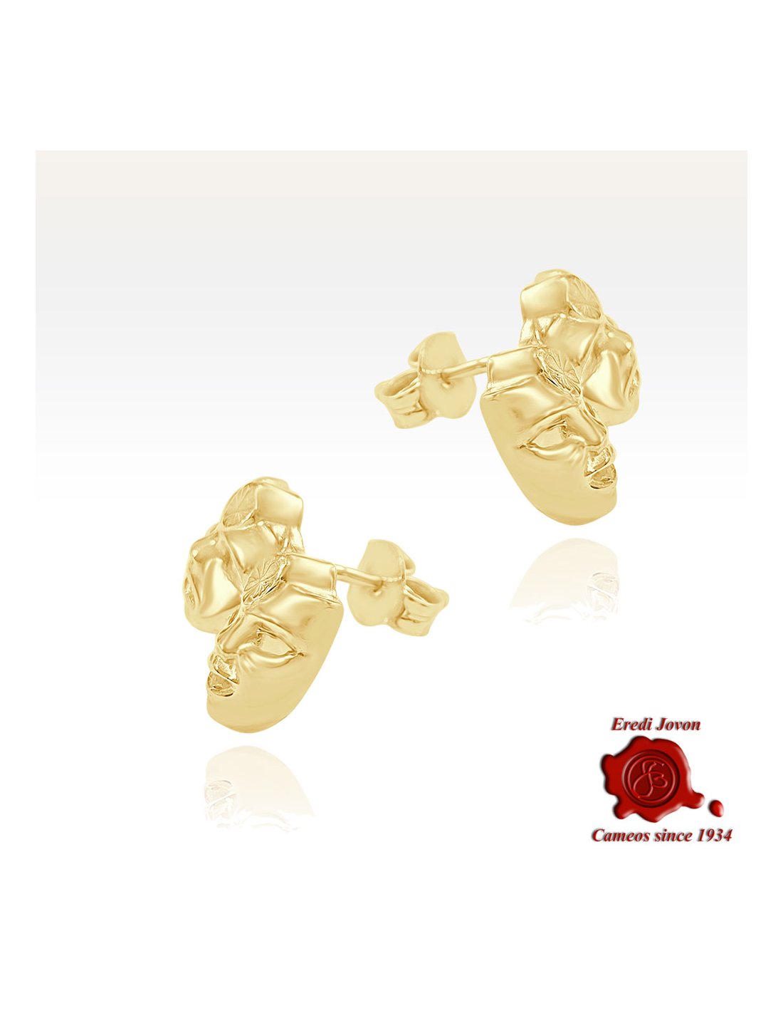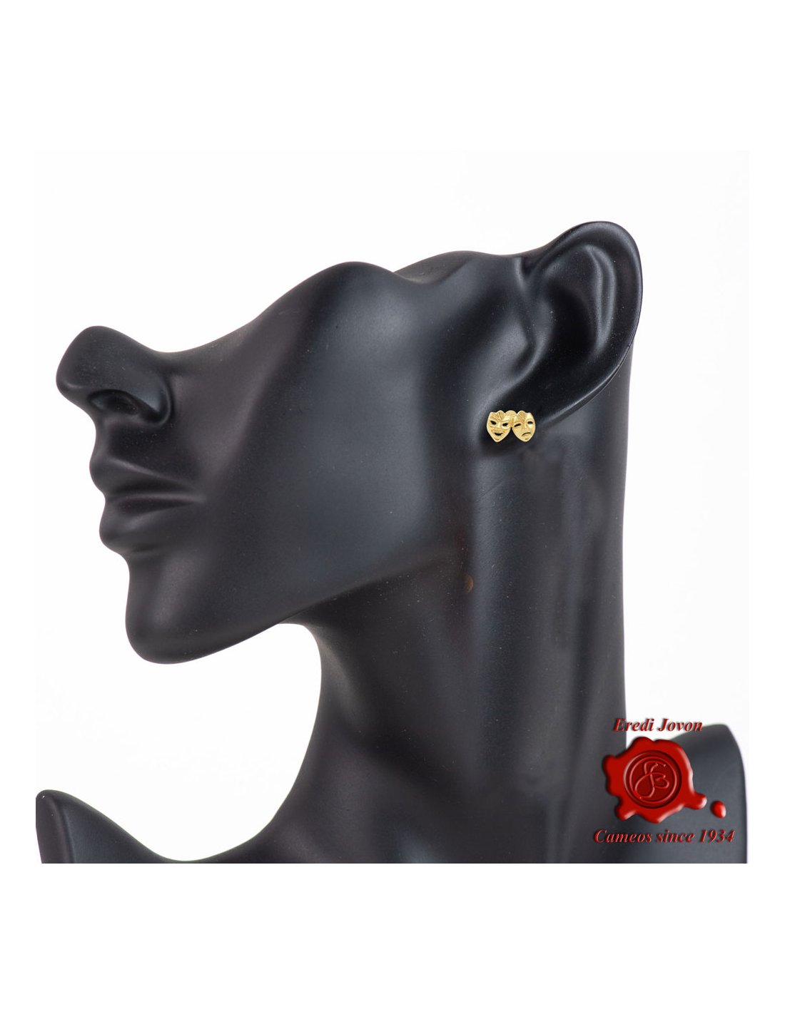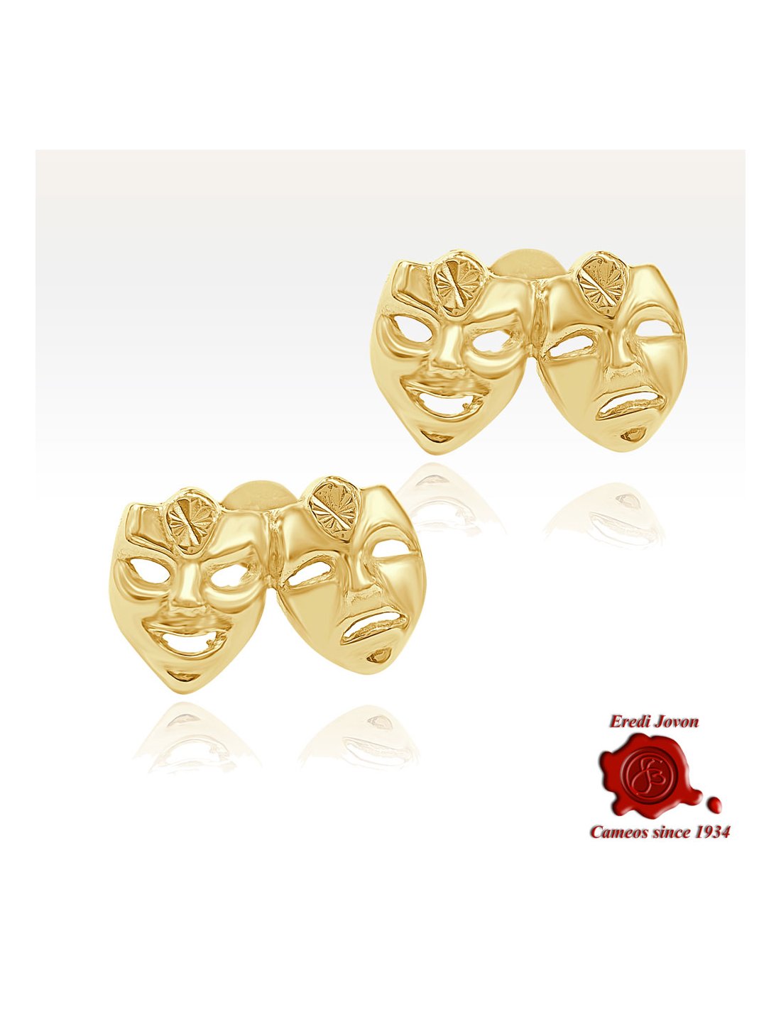 Yellow gold earrings depicting the iconic masks of classical theater: Comedy and Tragedy. A piece of jewelry that goes beyond aesthetics, rich in meaning, perfect for those who love art, culture and entertainment. Handcrafted by Eredi Jovon, a historic Venetian jewelry store since 1934, these earrings weave sophisticated aesthetics and cultural memory.
