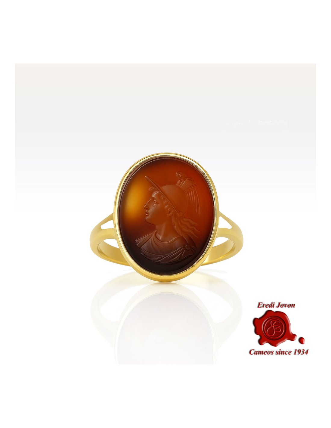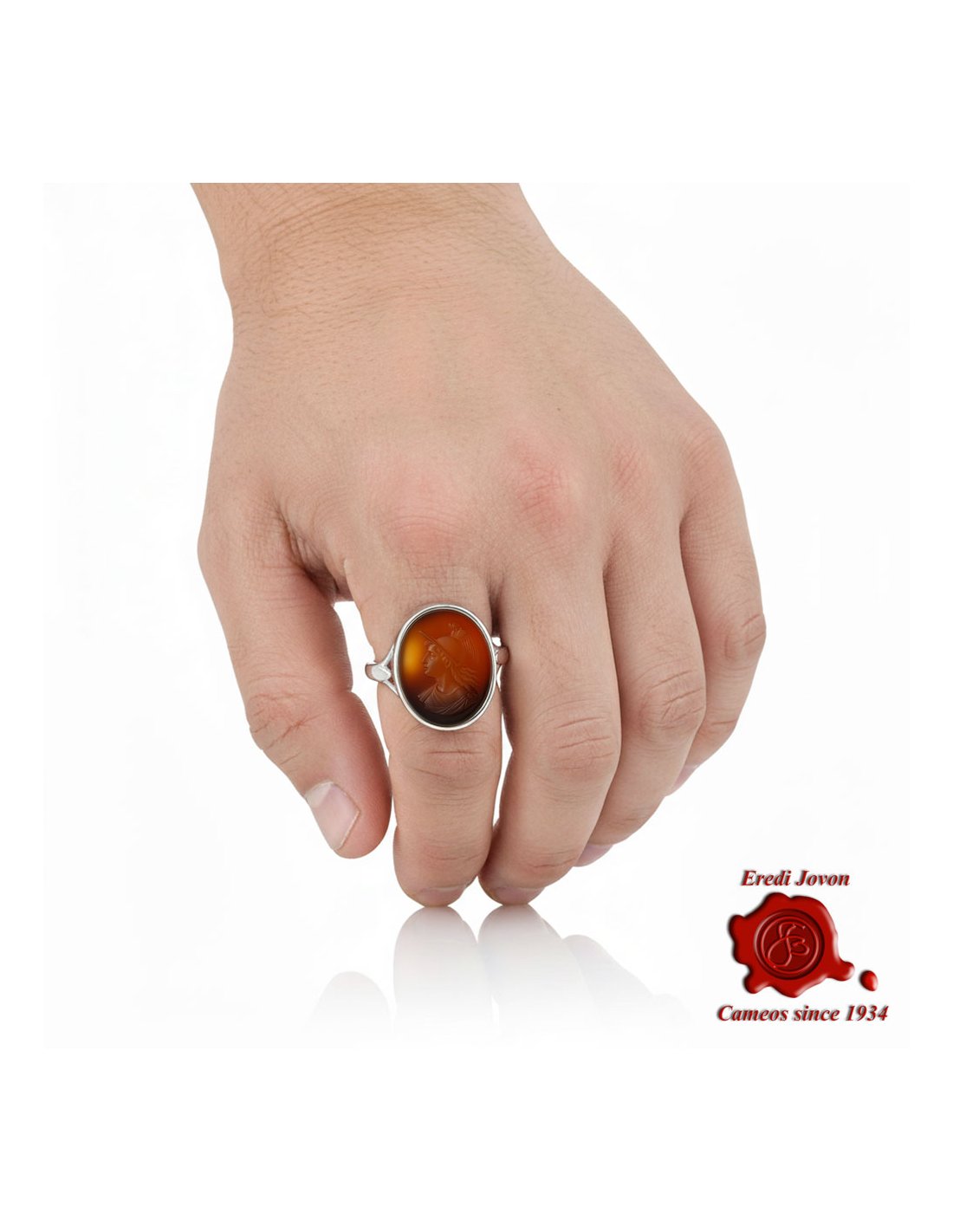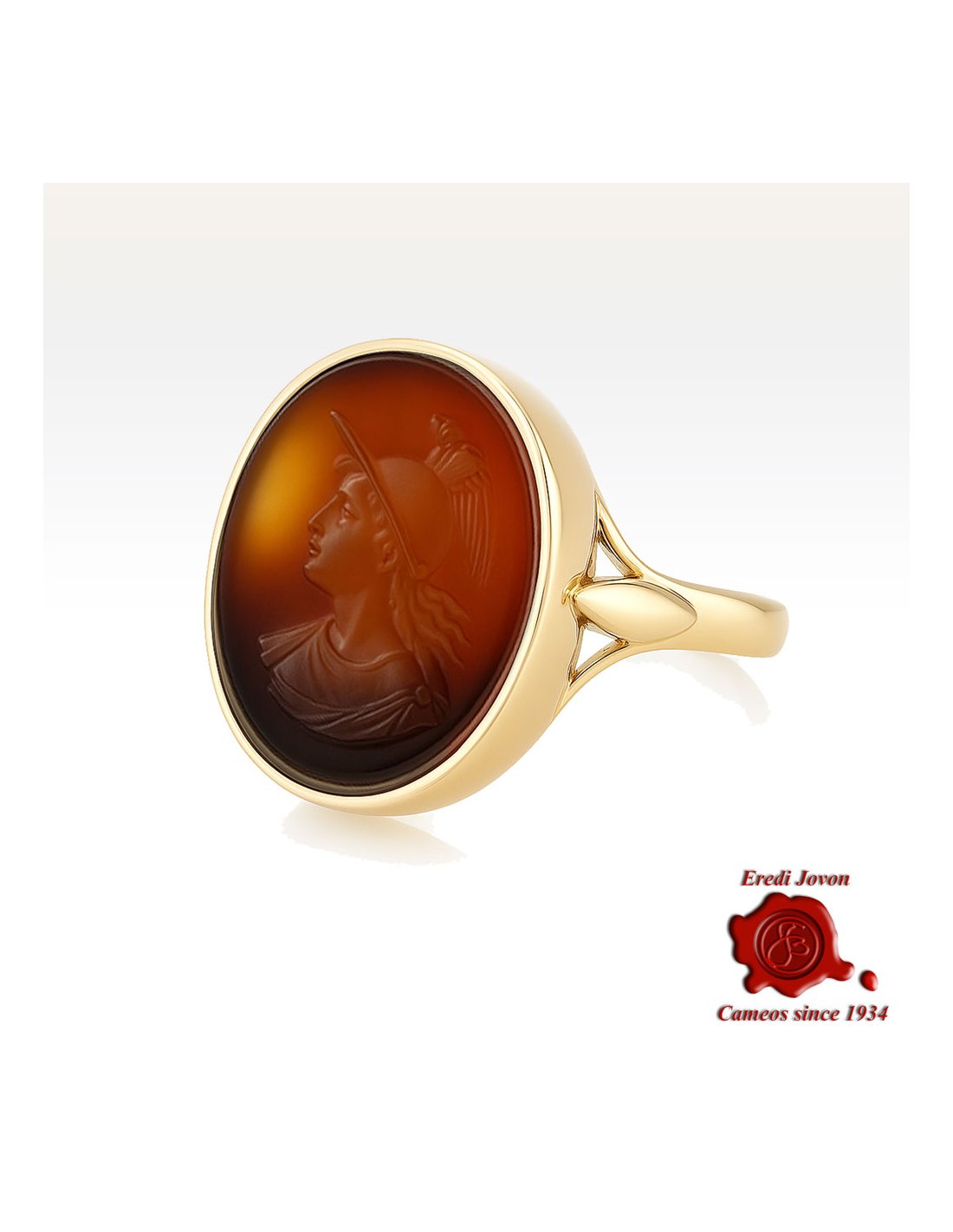 Nella sua figura si riflettono l’agilità della mente, la forza dell’ingegno e la libertà dello spirito — virtù che attraversano i secoli e parlano ancora di noi. Al centro dell’anello brilla una corniola, pietra dal colore del sole e della terra, che da millenni accompagna l’uomo come talismano di protezione e coraggio.