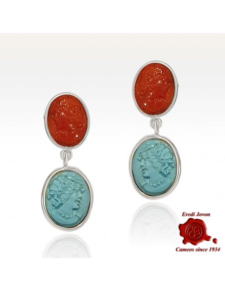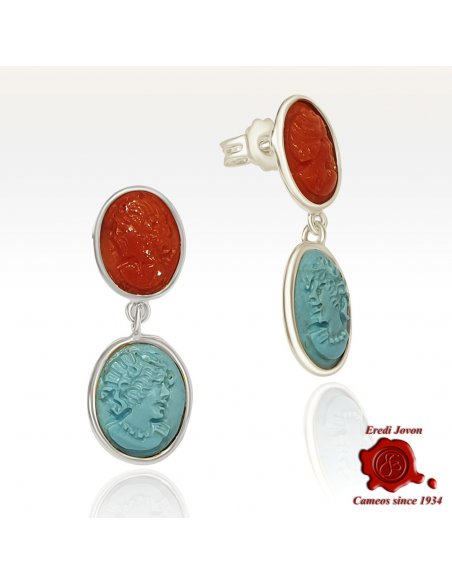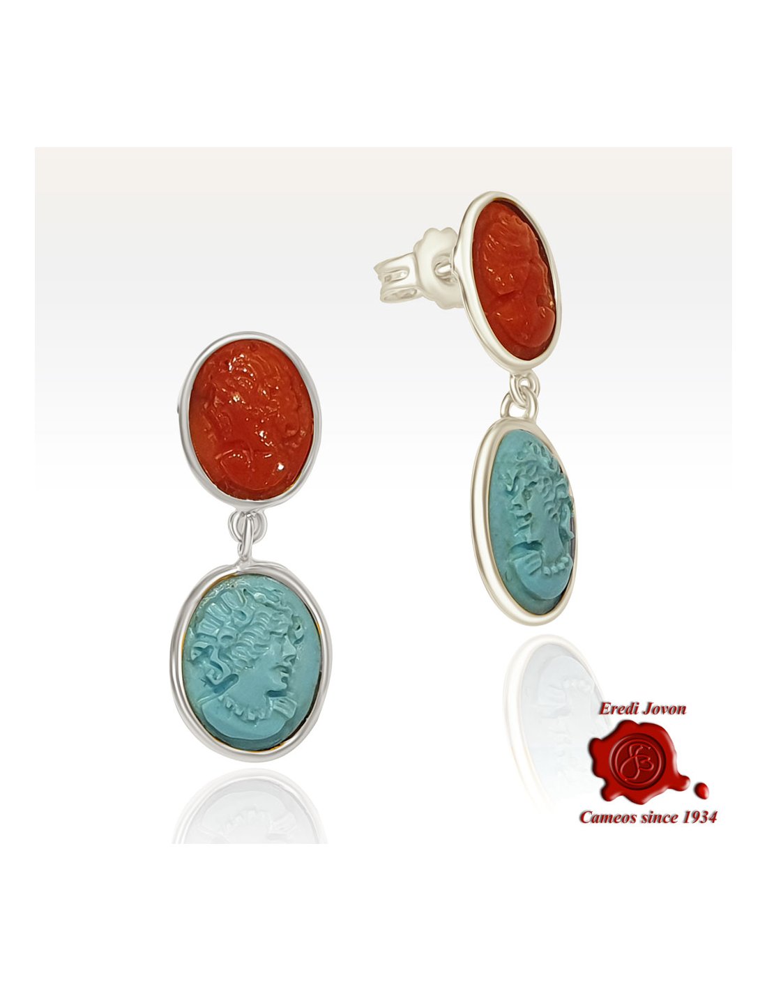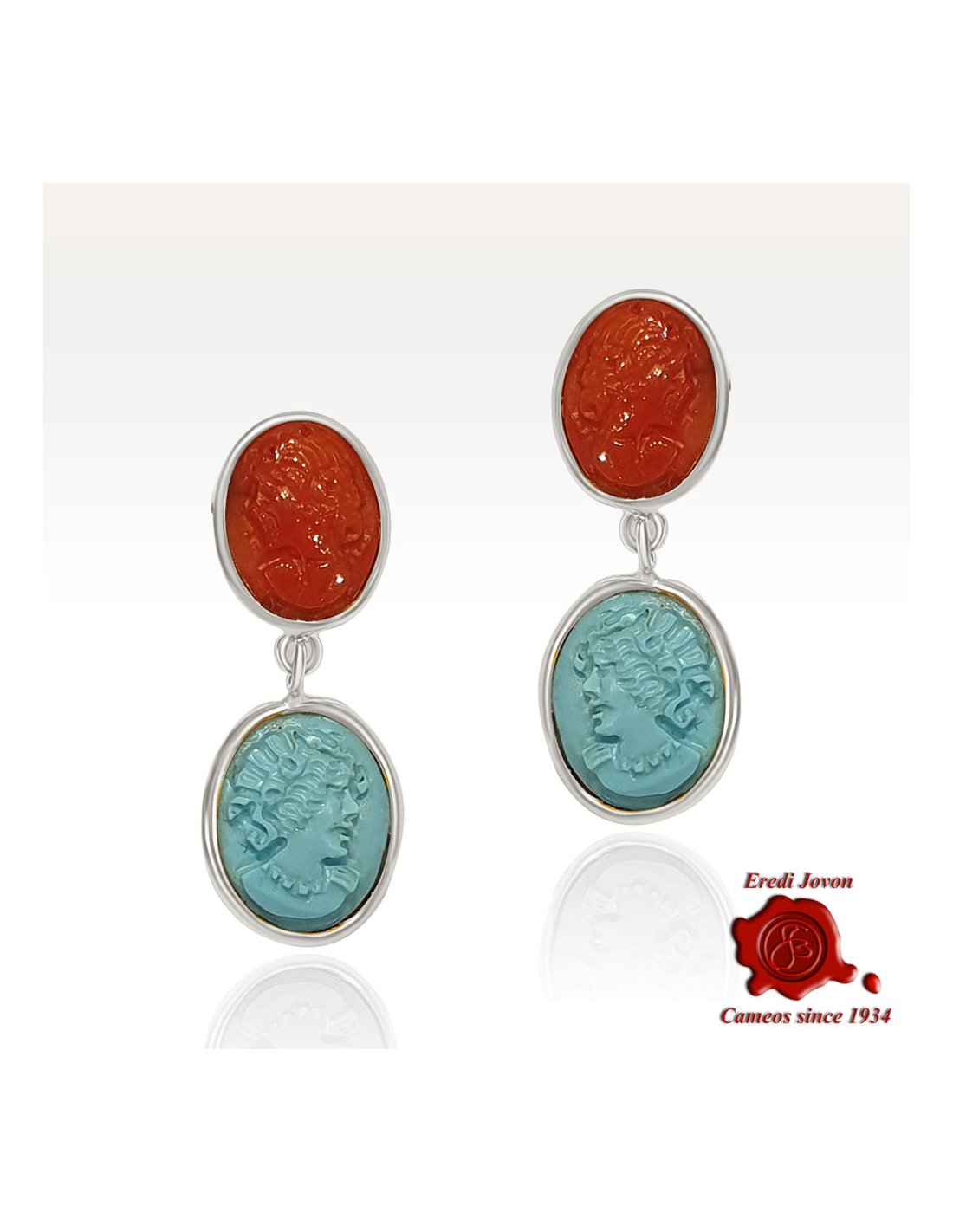 Raffinati ed eleganti, questi orecchini pendenti in argento 925 sono arricchiti da cammei in corallo e turchese, dei veri capolavori che portano con sé eleganza e raffinatezza, lavorati con maestria secondo la tradizione artigianale italiana. Un gioiello unico, in cui l'arte impeccabile della scultura del cammeo si mescola al fascino intramontabile dei materiali pregiati, dando vita a una creazione di classe. Perfetti per aggiungere un tocco di classe a qualsiasi occasione speciale, questo paio dinorecchini è una perfetta espressione di eleganza sublime e ricercatezza esclusiva, trasformandosi in un dettaglio che non passa inosservato.