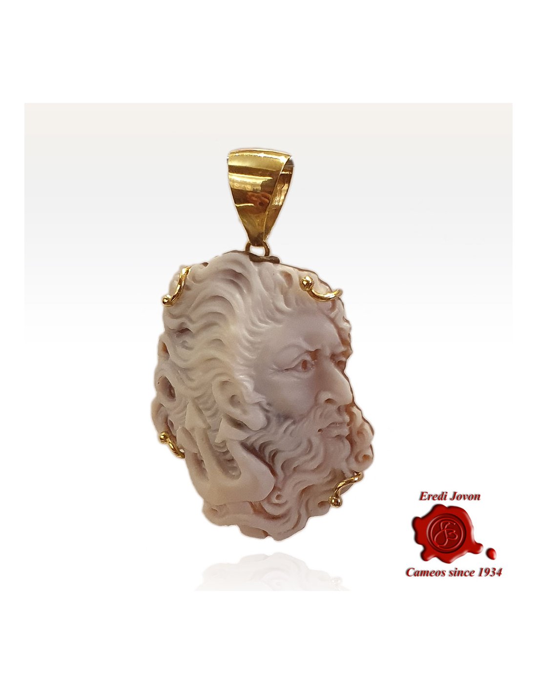 Simbolo di potere e mistero, questo cammeo evoca la forza di Poseidone, il dio del mare, rappresentato con una precisione artistica che trasuda eleganza e potere in un'incisione che cattura la sua grandezza in ogni dettaglio su conchiglia sardonica. In questo cammeo unico, il volto di Poseidone emerge con forza, impugnando il tridente, simbolo di maestosità e dominio sui mari infiniti e misteriosi. Ogni particolare di questa straordinaria creazione è messo in risalto da una montatura in oro a griffe, che conferisce un'eleganza senza pari. Questo gioiello è una fusione perfetta di arte antica e tradizione orafa veneziana, un pezzo che cattura l'essenza della mitologia e la bellezza senza tempo della natura.
