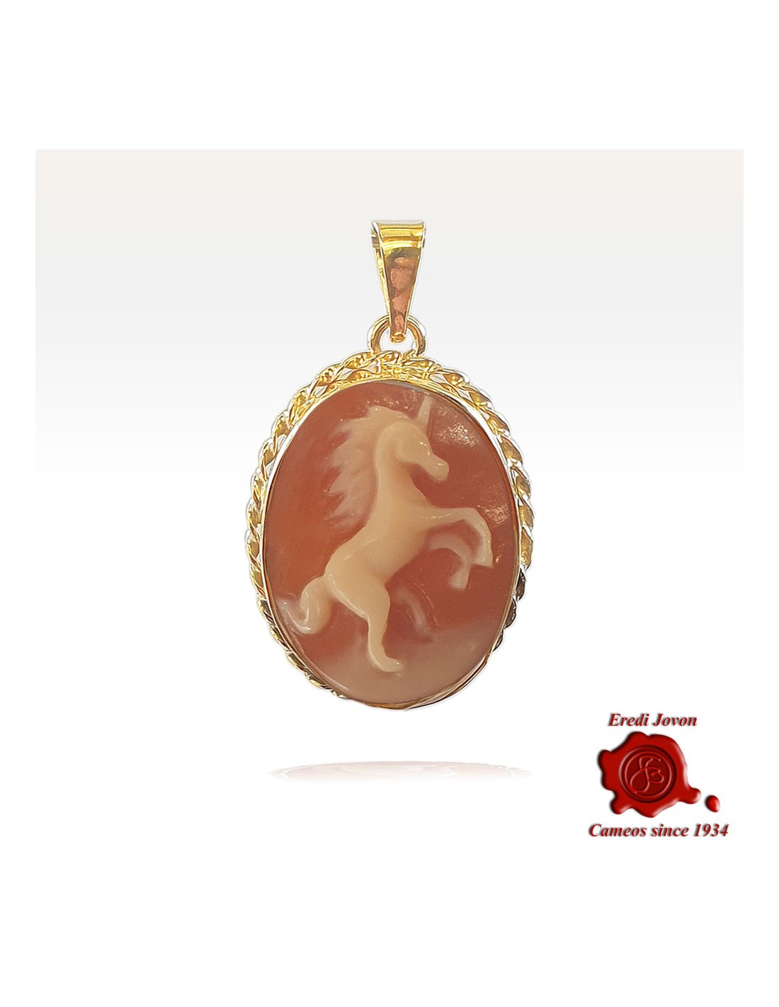 Cammeo Unicorno in Conchiglia con Montatura in Oro Giallo - Un raffinato cammeo inciso a mano che raffigura un unicorno che salta libero, simbolo di purezza e magia. La montatura in oro giallo da un tocco fiabesco ed elegante a questo gioiello esempio della maestria artigianale veneziana. Un gioiello senza tempo, perfetto per chi ama le storie legate a questo leggendario animale.