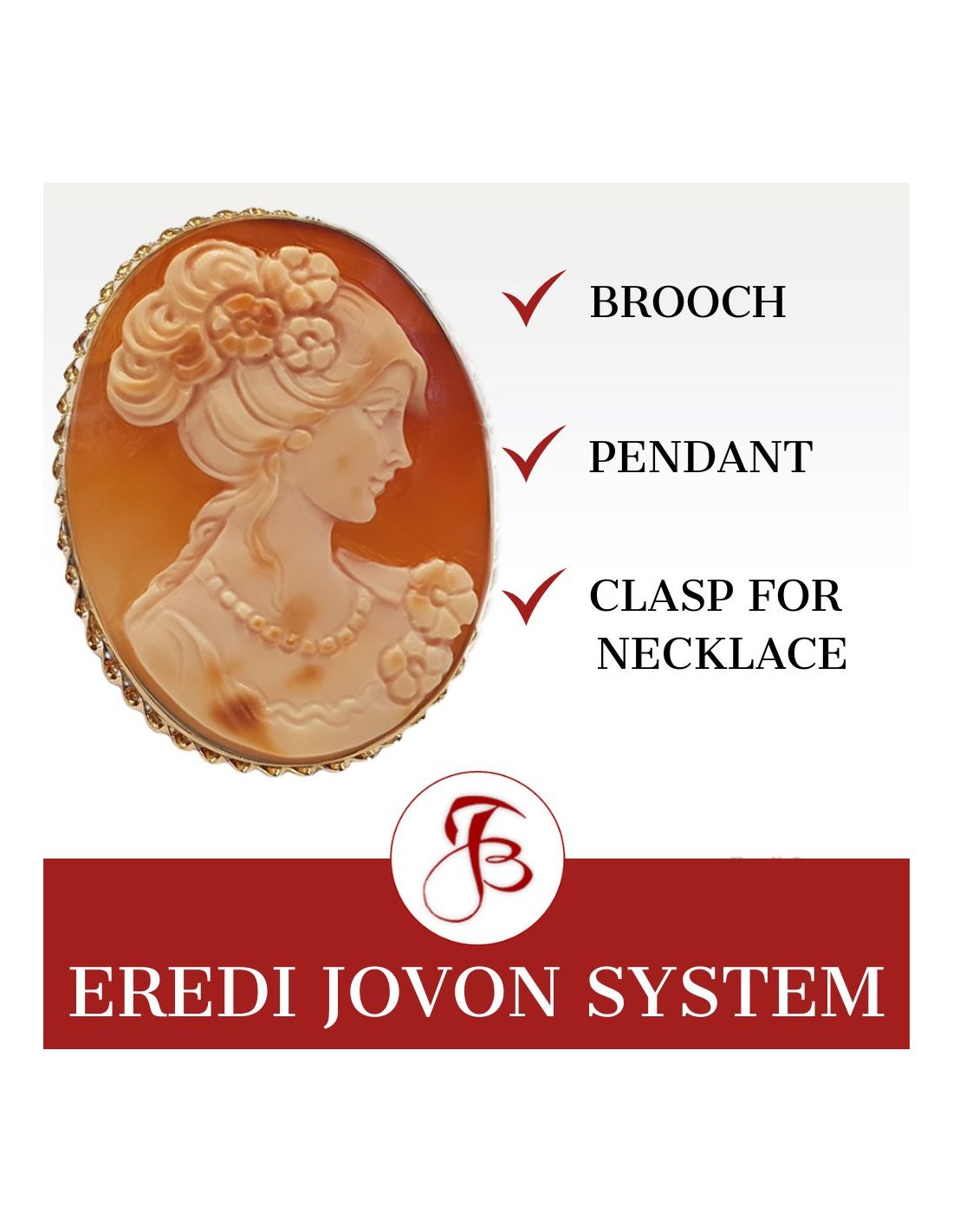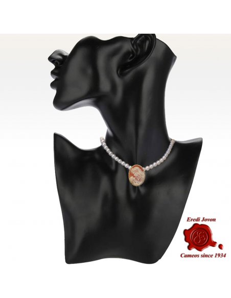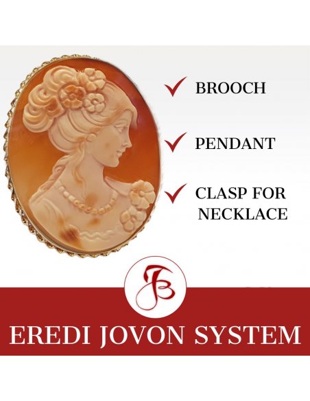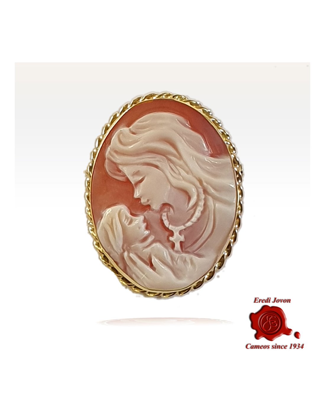 Spilla Cammeo in oro della Vergine Maria con Gesù Bambino - Cammeo artigianale di prima qualità che può essere usato come spilla e anche come ciondolo, intagliato con precisione straordinaria a mano in conchiglia corniola. Un gioiello di alta qualità con montatura in oro giallo e finitura in "corda veneziana". E' evidente l'ispirazione al capolavoro di Leonardo da Vinci, La Vergine delle Rocce. Un'espressione unica di devozione e maestria, realizzata a mano con dettagli e abilità eccezionali. Sistema Eredi Jovon incluso!