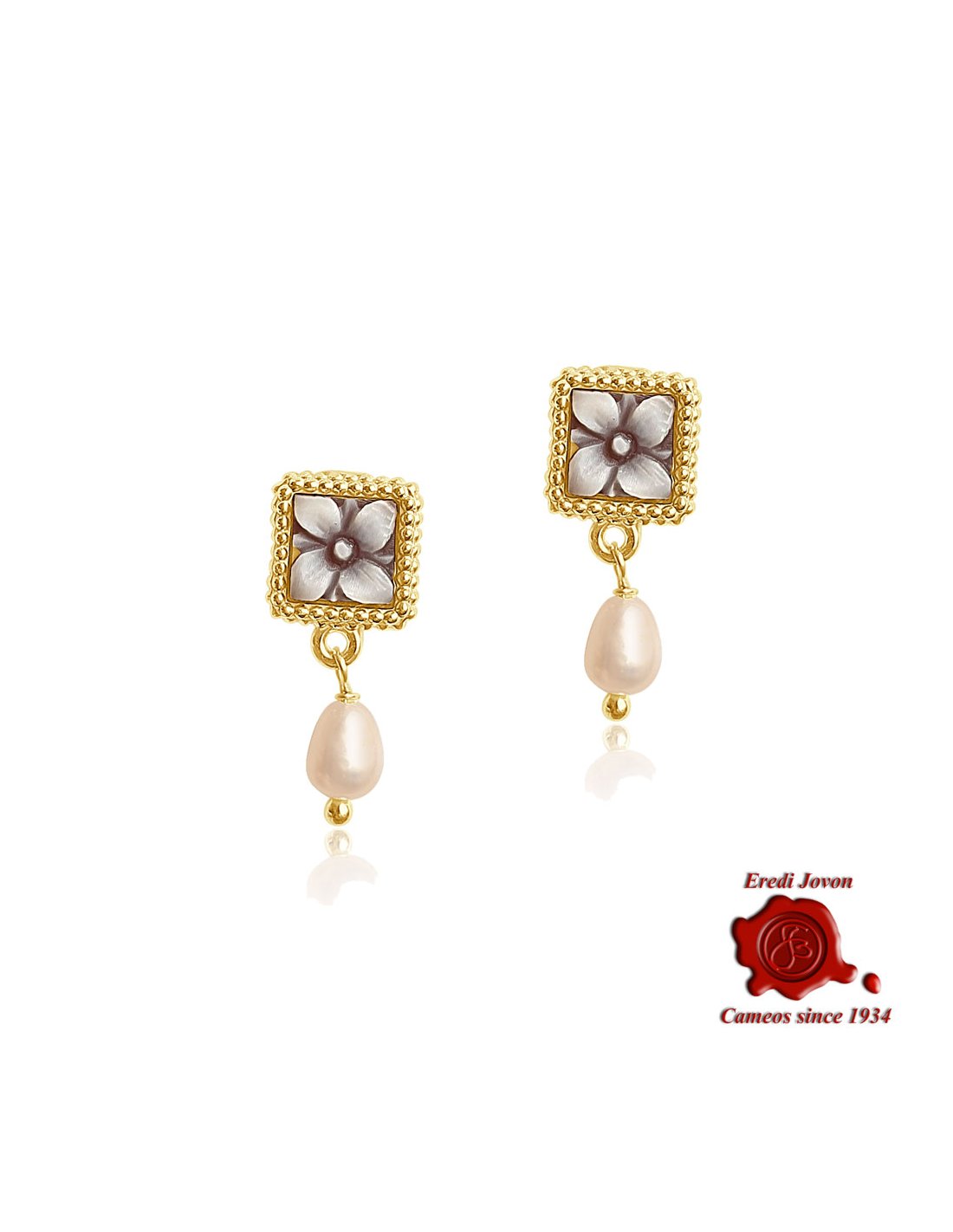 Fiore con Perla Orecchino Cammeo in argento dorato - un gioiello sofisticato che coniuga semplicità e modernità, pensato per esaltare l'eleganza naturale di ogni donna. - perfetto da portare al lavoro o durante la gita "fuori porta" della Domenica. Tutte le vostre amiche vi guarderanno con curiosità e magari diventerà un bell'argomento di conversazione. Cammei incisi a mano.