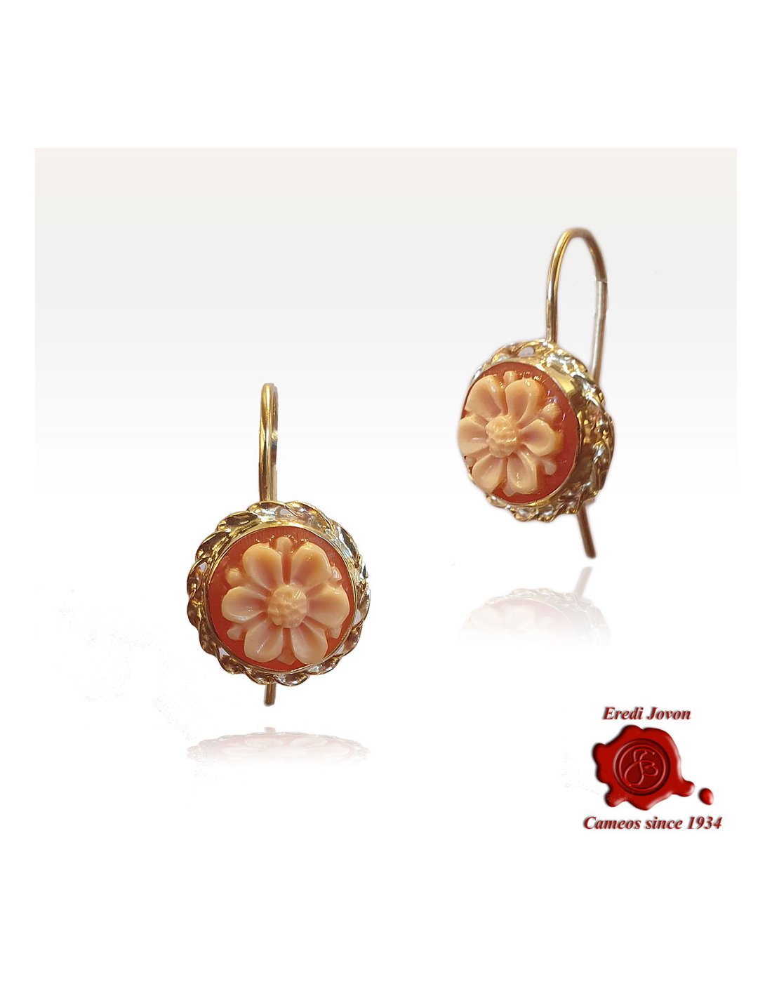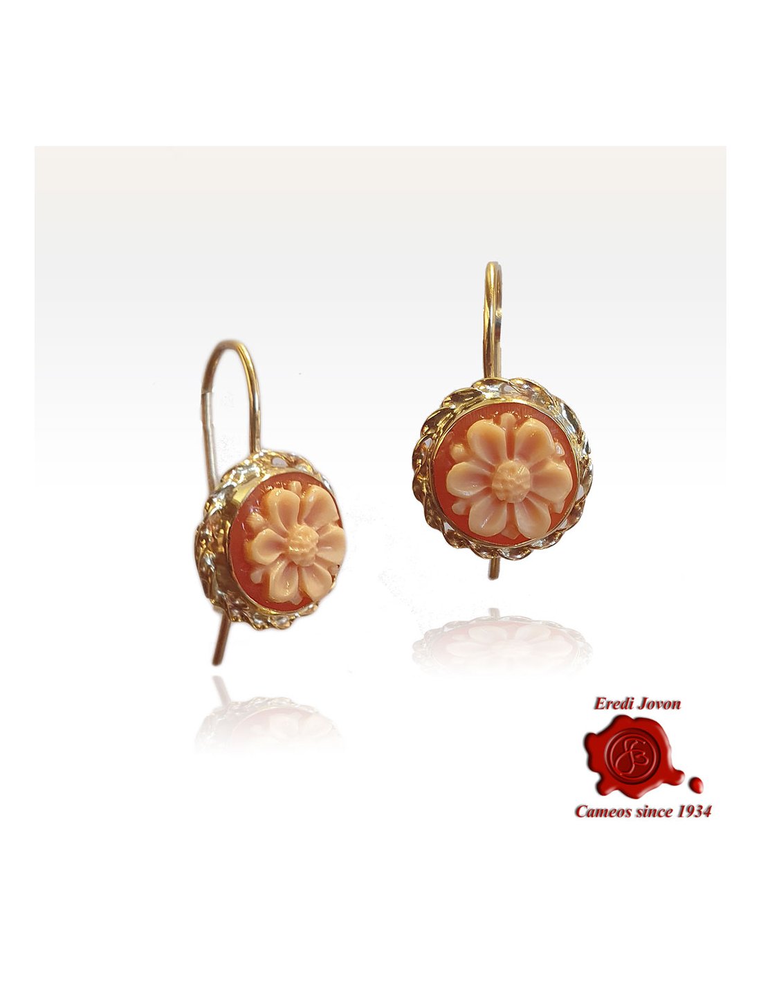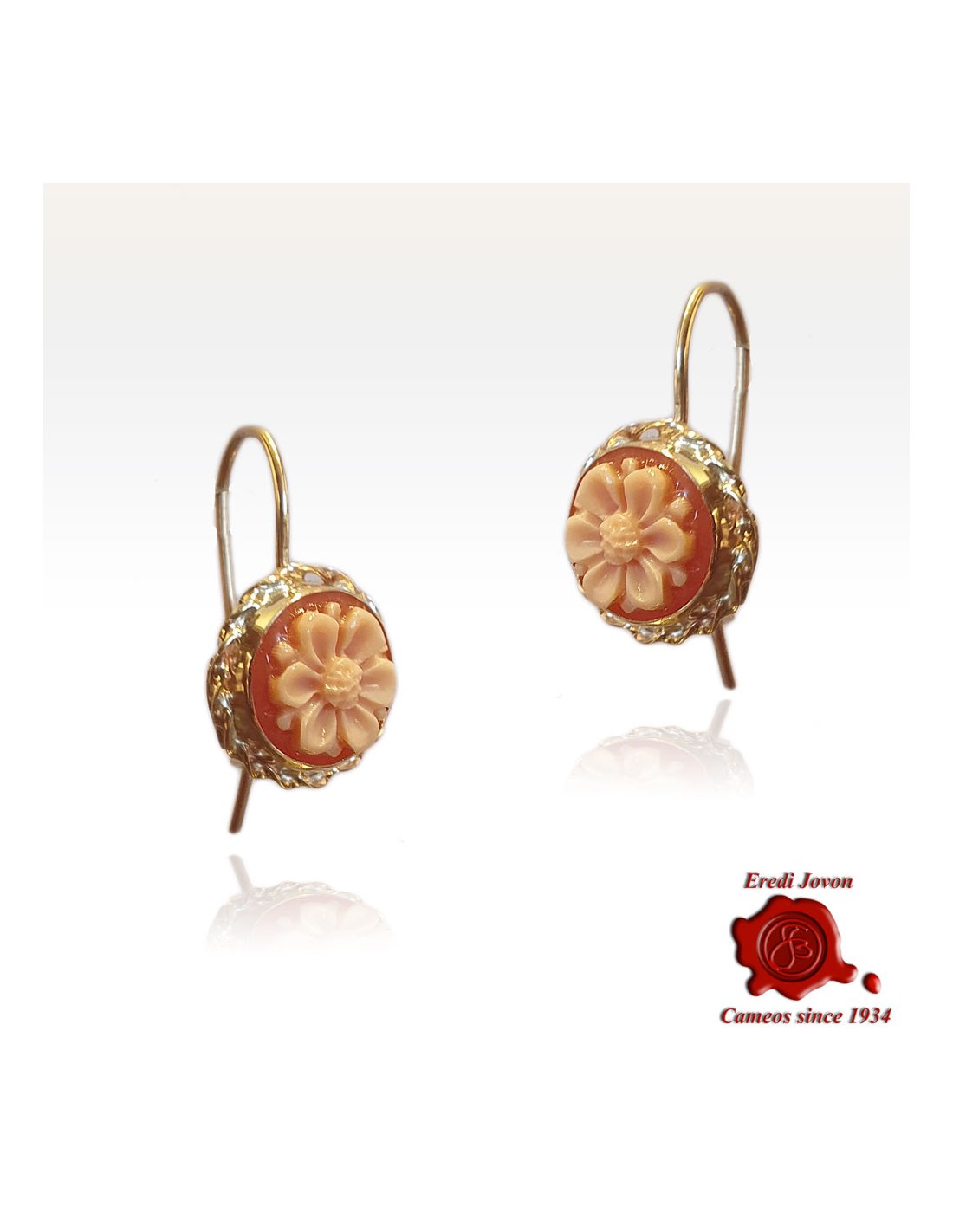 Questo paio di eleganti orecchini pendenti uniscono perfettamente la maestria artigianale italiano e il fascino del vintage. Il cammeo, intagliato a mano meticolosamente su conchiglia, ritrae una margherita sapientemente scolpita con una precisione artigianale unica. Il motivo floreale, ispirato alla moda dei secoli 18° e 19°, fa rivivere un'epoca di eleganza senza tempo per chi lo indossa, evocando la bellezza delle opere del passato. La montatura in oro giallo, con il suo esclusivo stile a corda veneziana, impreziosisce il design con un'ulteriore eleganza, rendendo questi orecchini un pezzo unico e prezioso.