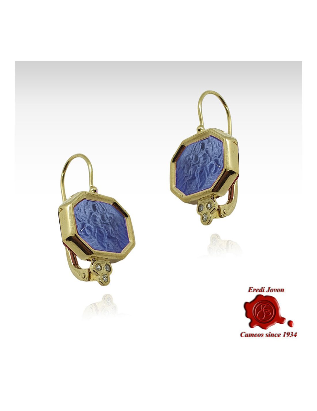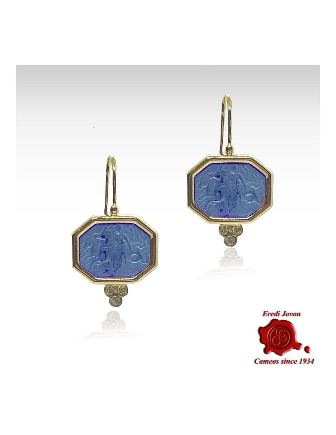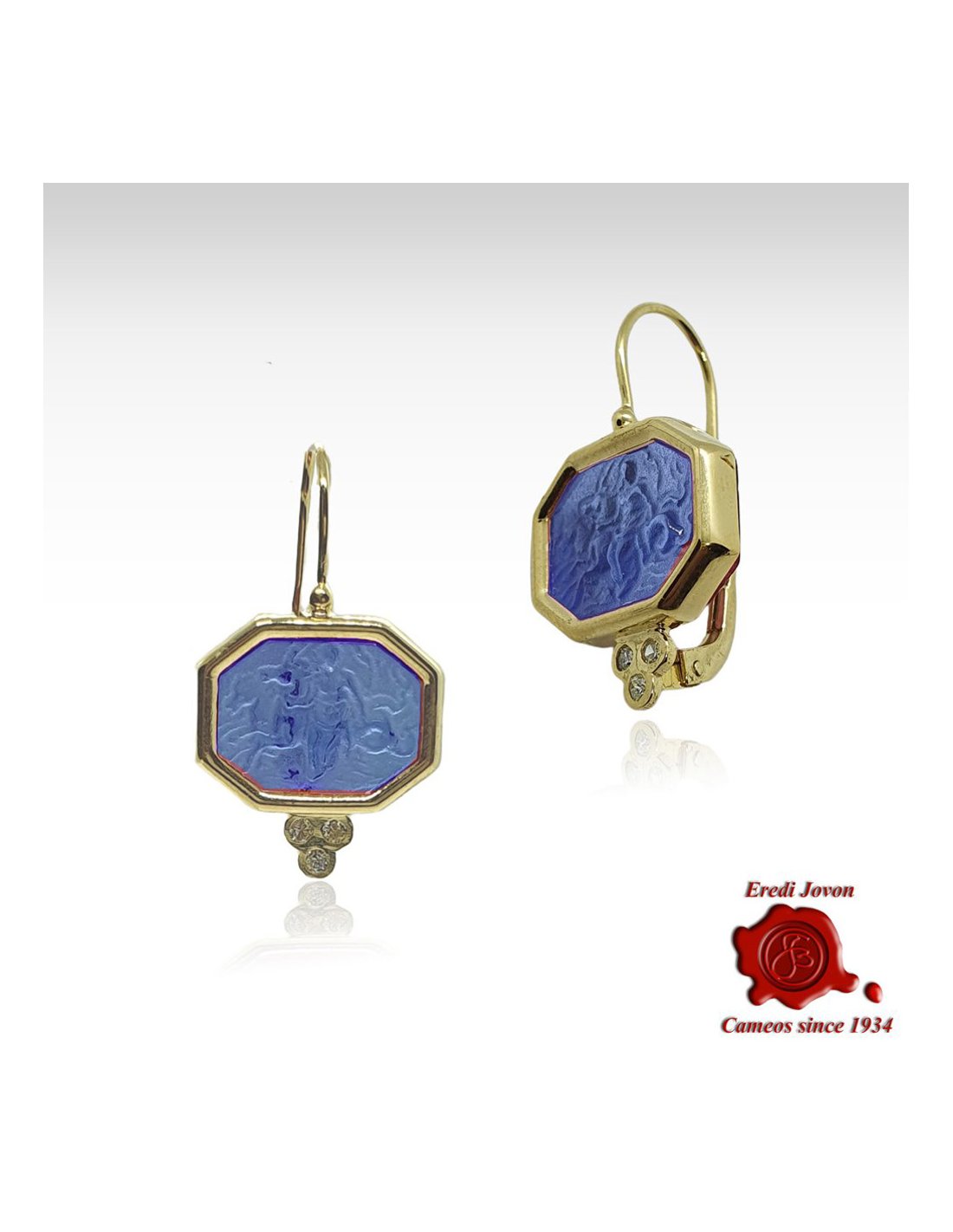 Un orecchino bellissimo in oro giallo con una straordinaria pasta vitrea di un bel blu ceruleo - un gioiello unico e bellissimo che rappresenta una ninfa marina. Le nereidi fanciulle con i capelli ornati di perle e a cavallo di delfini o ippocampi erano creature benevole portatrici di doni. L'orecchino è impreziosito da tre brillanti molto luminosi che lo impreziosisce rendendolo unico e ancora più splendente.