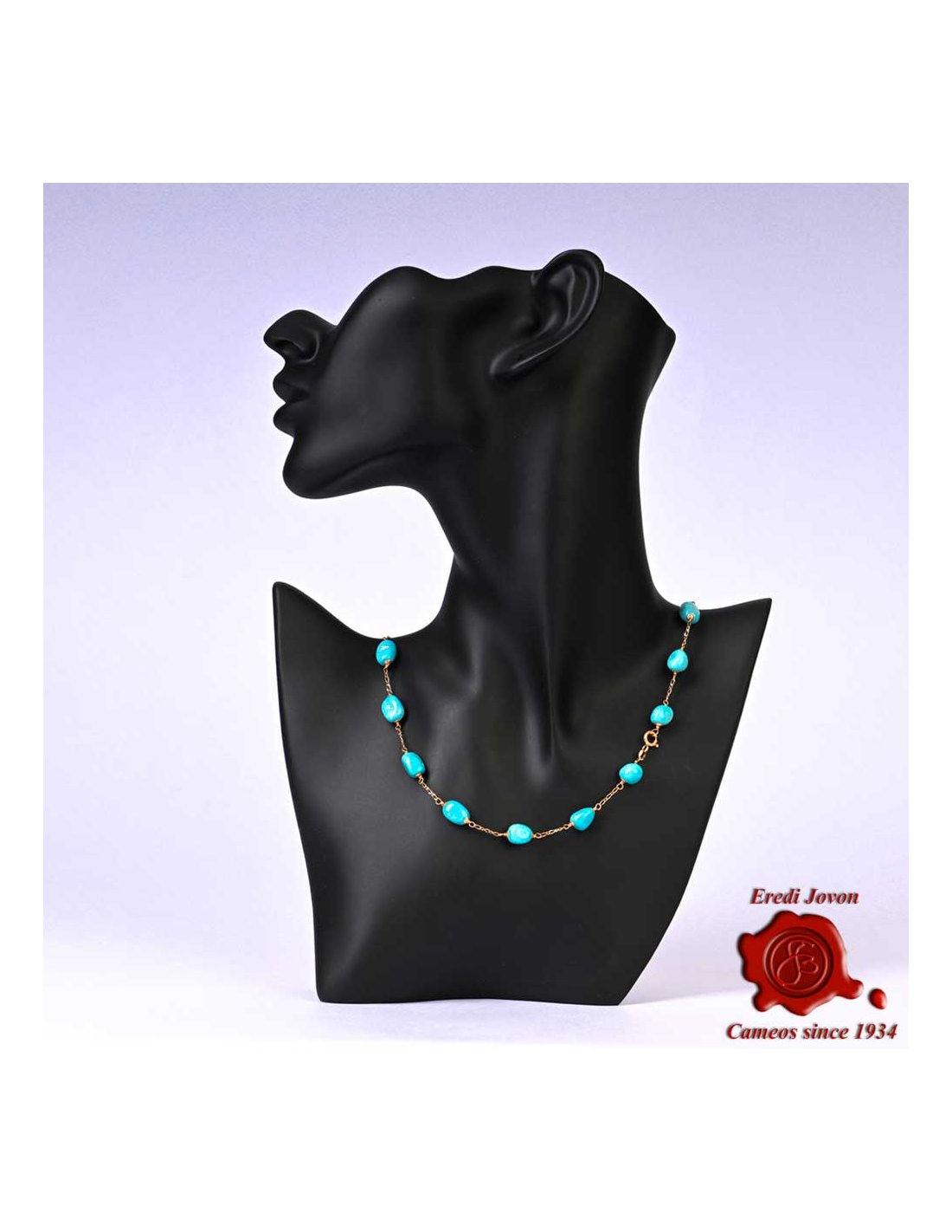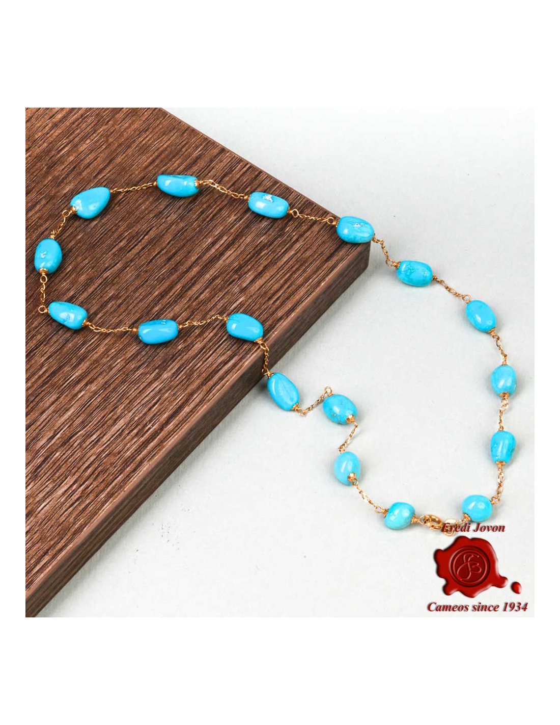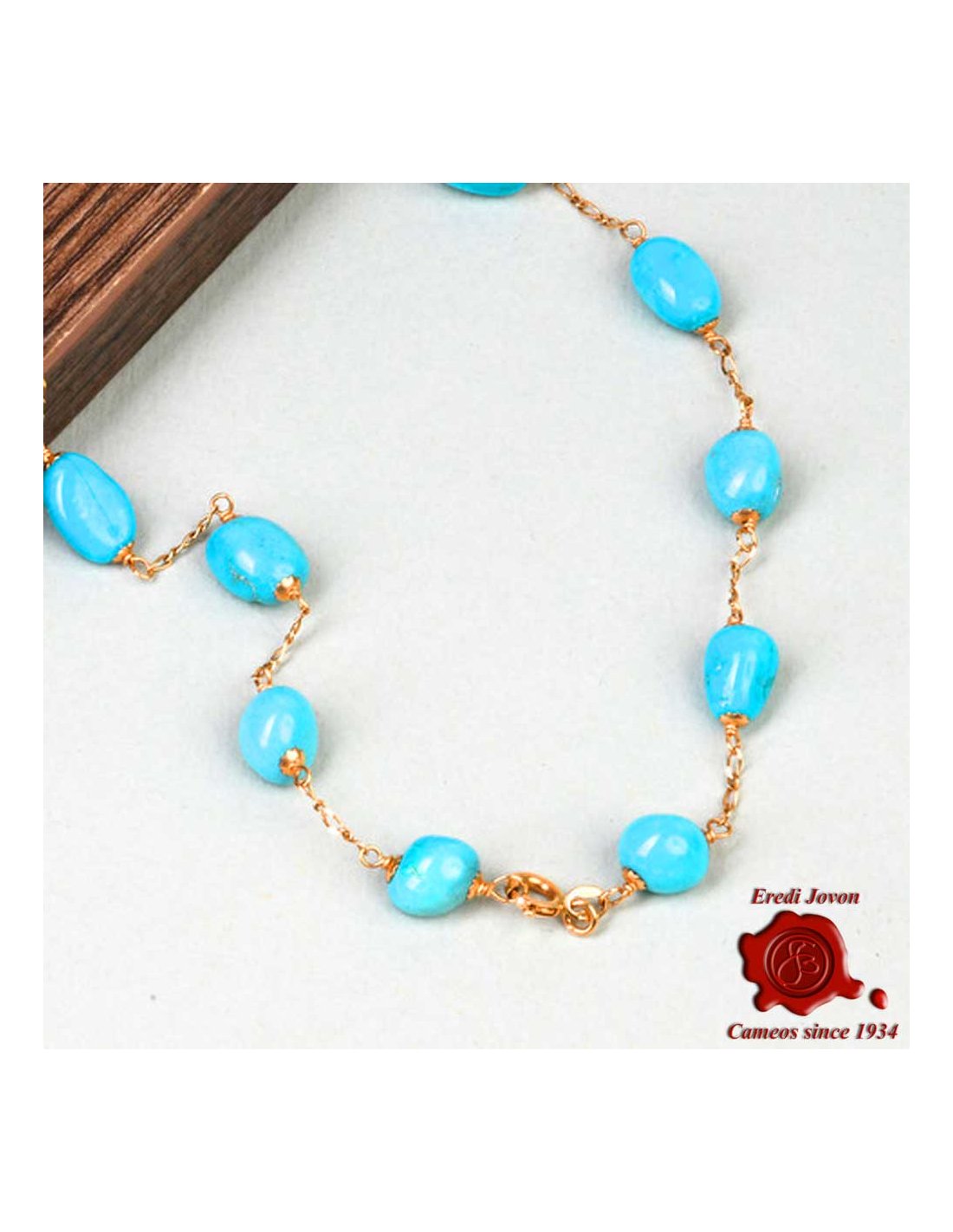 Girocollo con catena in oro giallo inframezzato da pietre di Turchese - Splendidi turchese naturali a forma di sasso connessi da una sottili ed elegante catena ad anelli di oro 18 carati. Il girocollo collegato al bracciale nello stesso stile (in vendita sul nostro sito) va a formare una catena lunga da usare anche sopra il pullover di inverno.