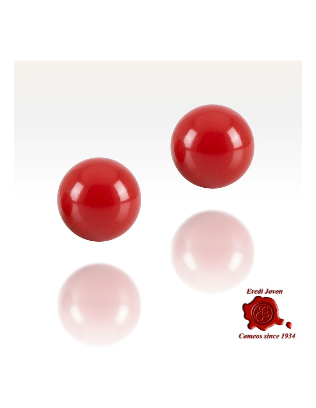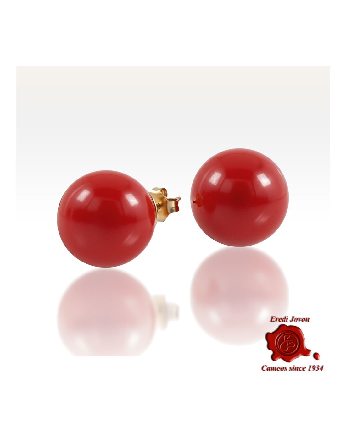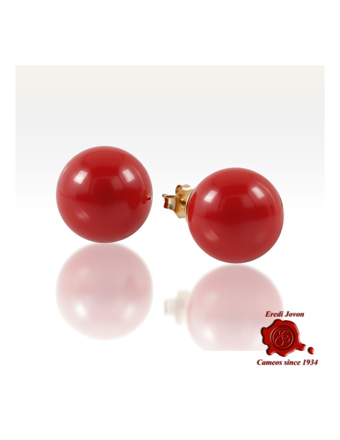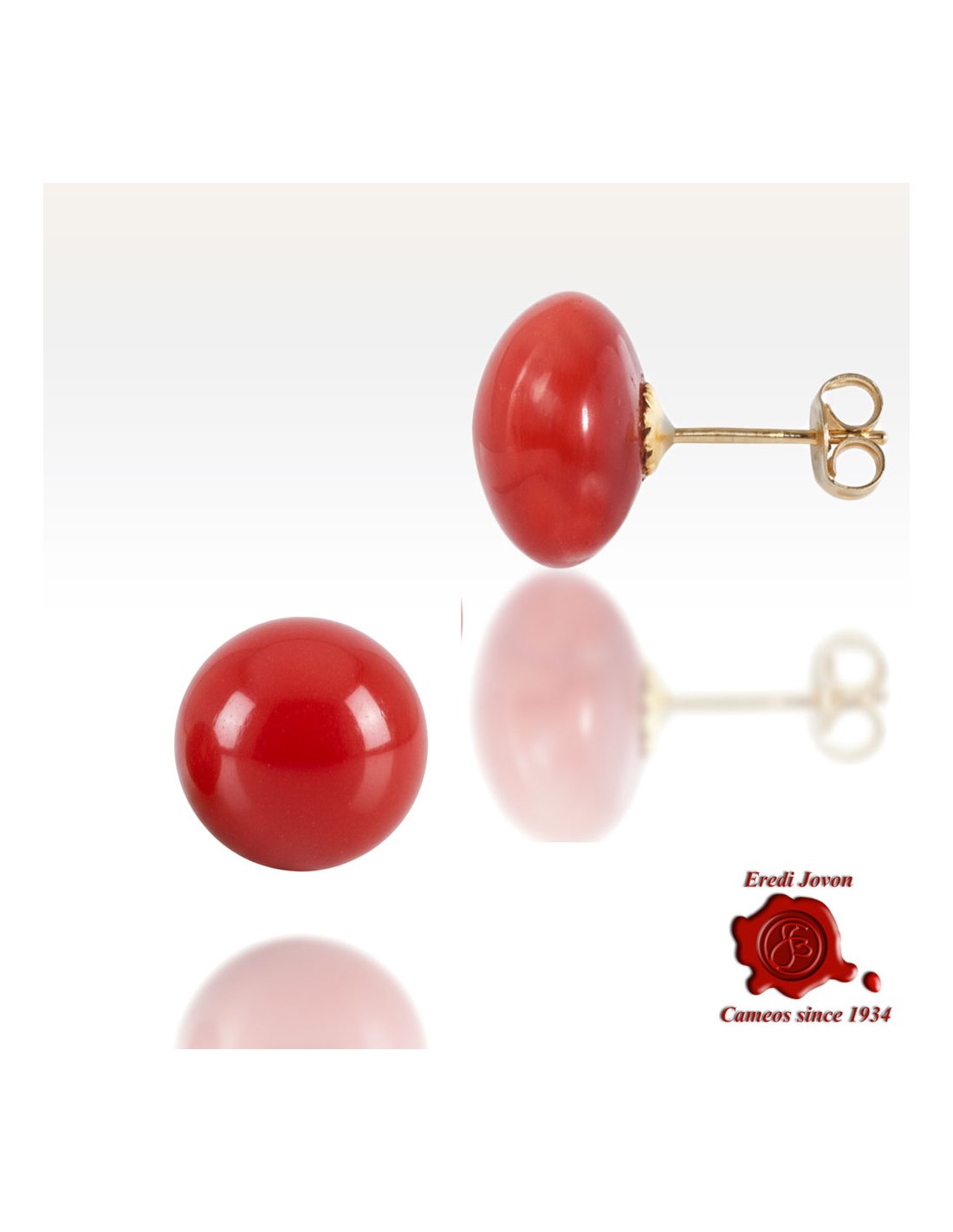 Orecchino corallo rosso mediterraneo oro 18 carati - Orecchino in vero corallo rosso italiano mediterraneo di prima qualità sagomato a bottone (pallina schiacciata), montatura a perno in oro 18 kt.