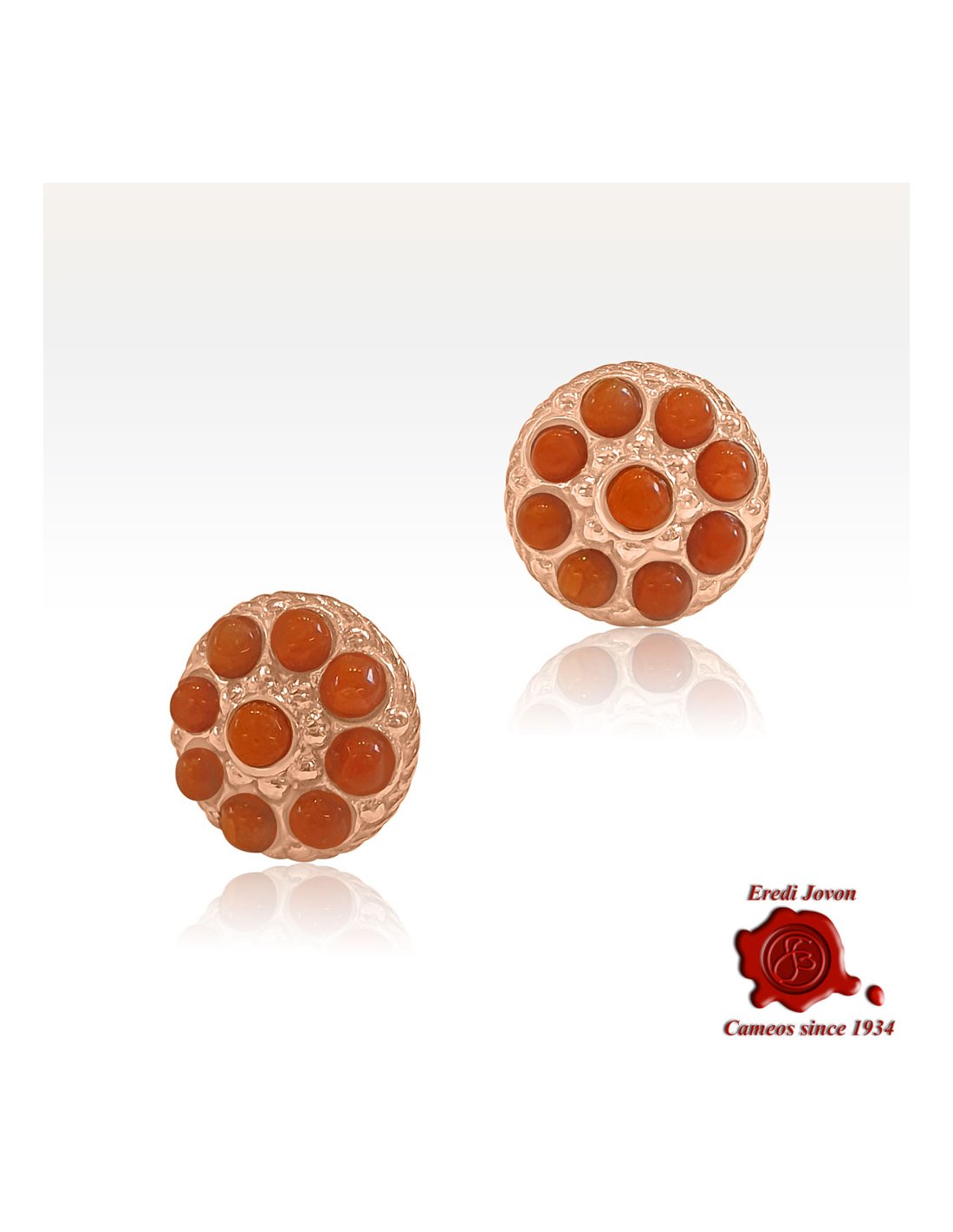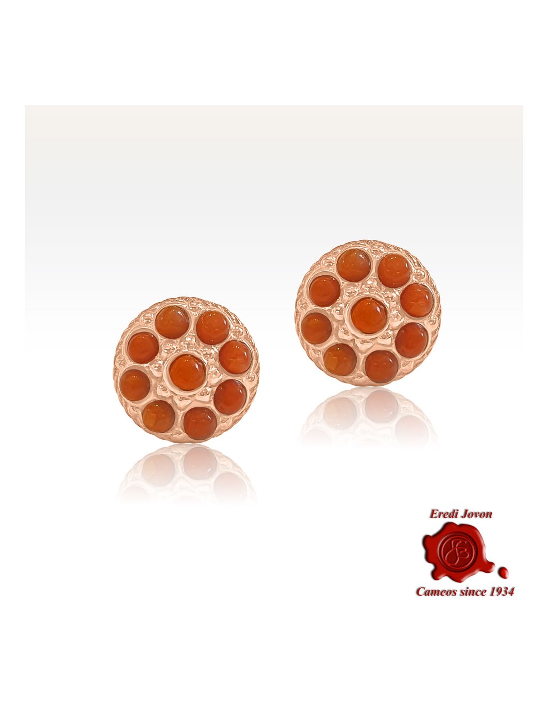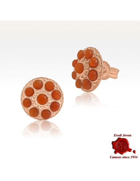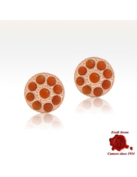 Orecchino in stile borbonico con corallo rosso - riproposizione in argento dorato in oro rosa del tipico tappa buco di fine ottocento con particolari in corallo rosso del mediterraneo. L'oro rosa, tipico del periodo, e l'intricata lavorazione a sbalzo del metallo danno a questo gioiello un tocco vintage.