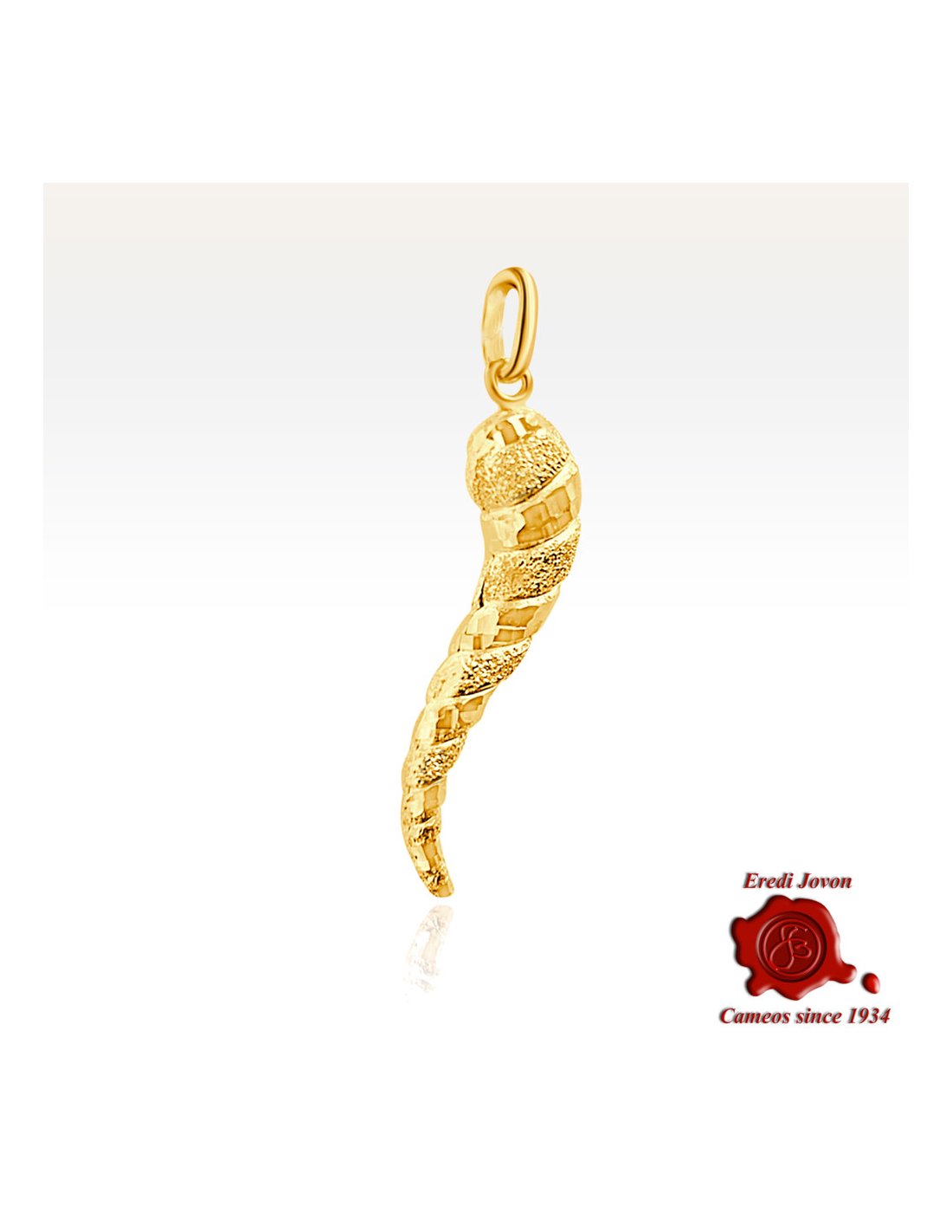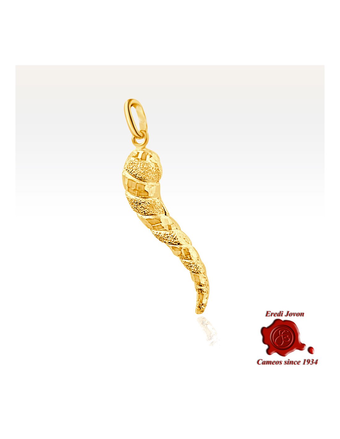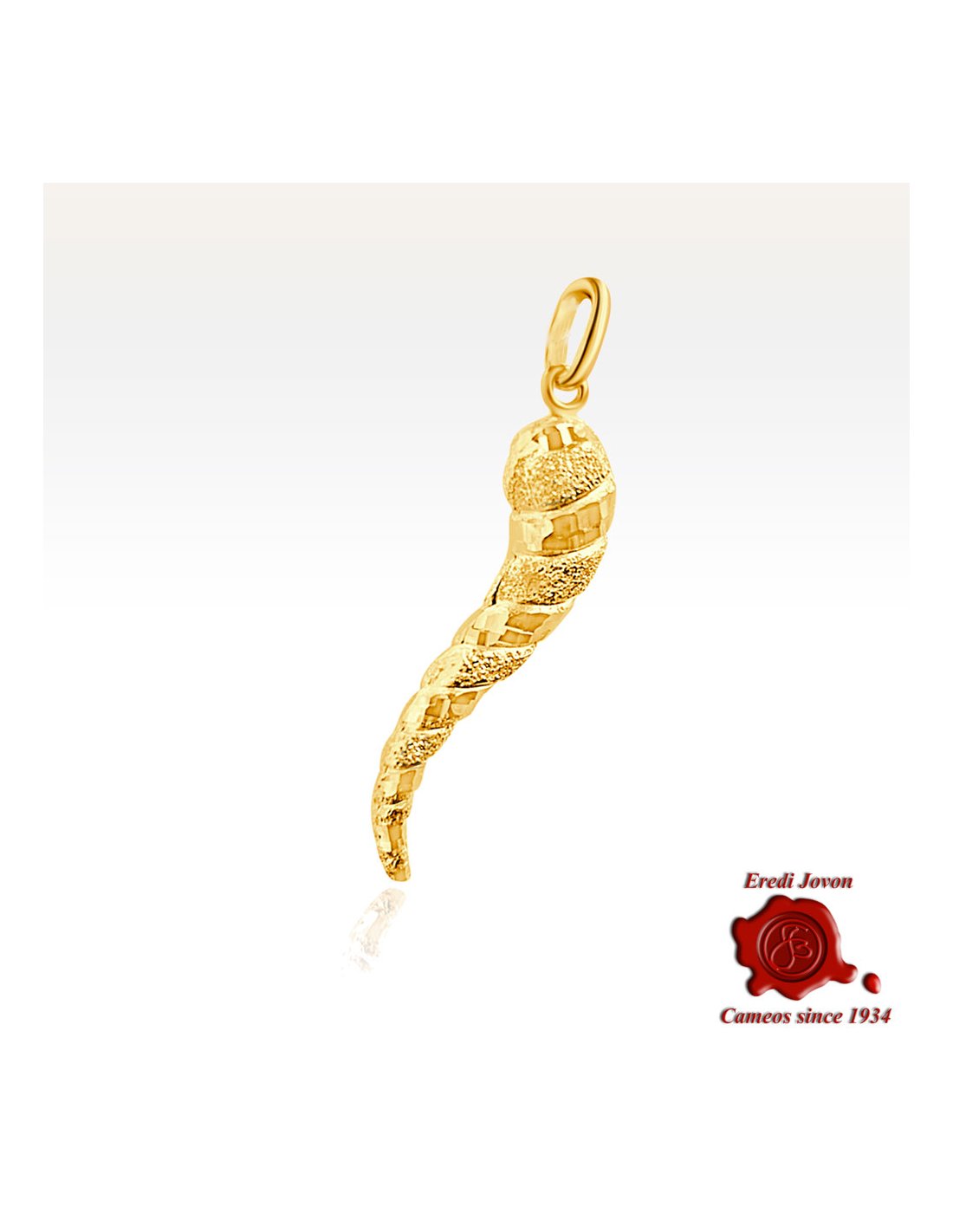 Cornetto in oro giallo 18 kt con lavorazione sabbiata - Un cornetto inusuale e fuori dal comune per un gioiello che parla di te. Questo amuleto è lavorato a mano con la tecnica della sabbiatura (una lavorazione che rende splendente, come la polvere di stelle, la parte che va a impreziosire). E' un gioiello un pochino diverso dal solito e da la l'esatta sensazione di portare ancora più fortuna!