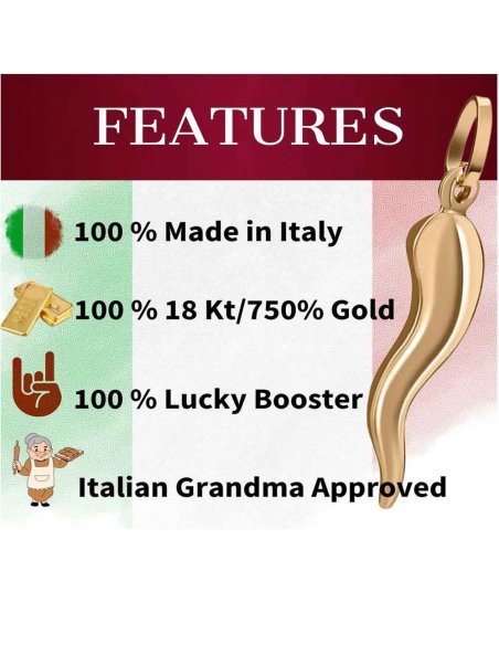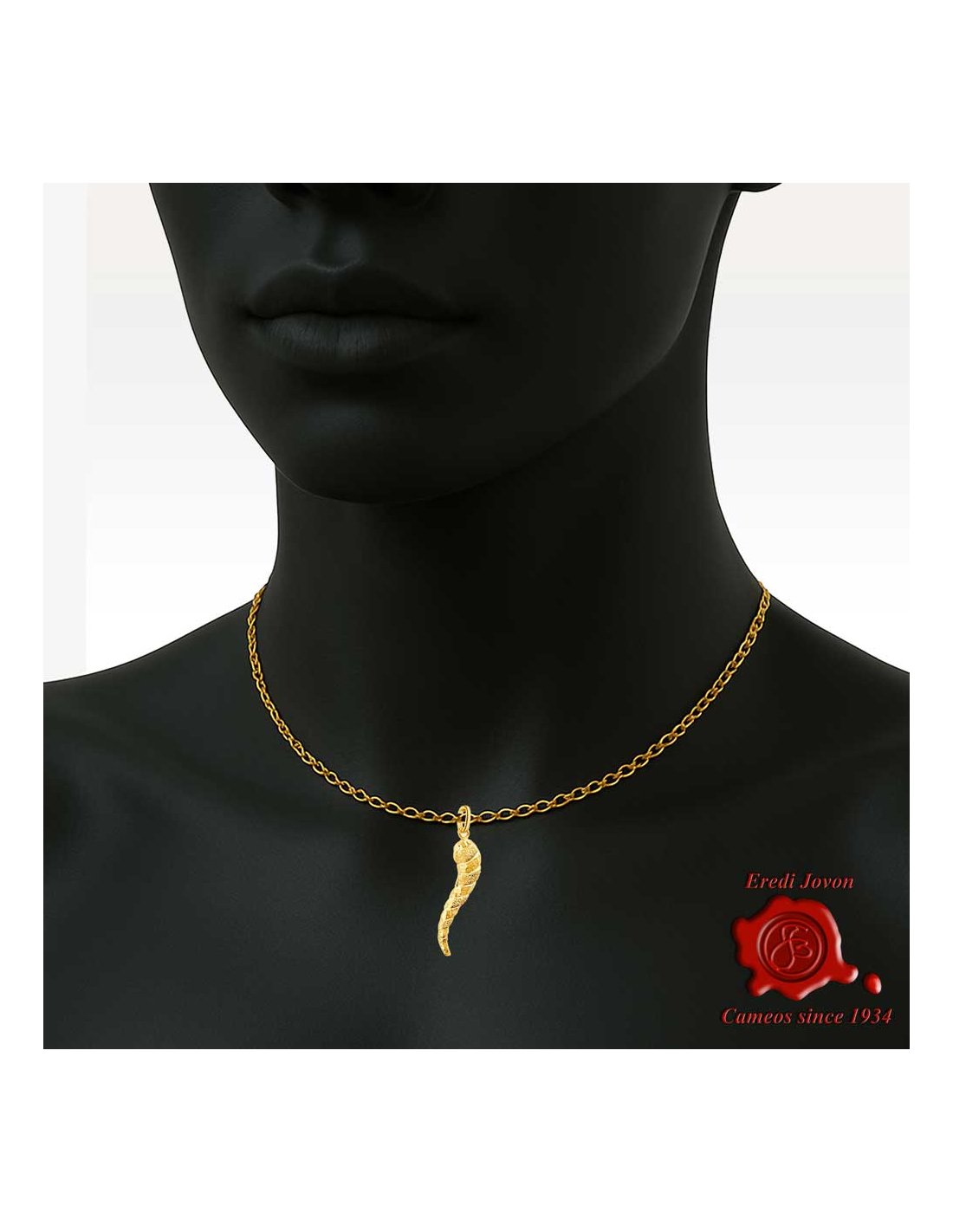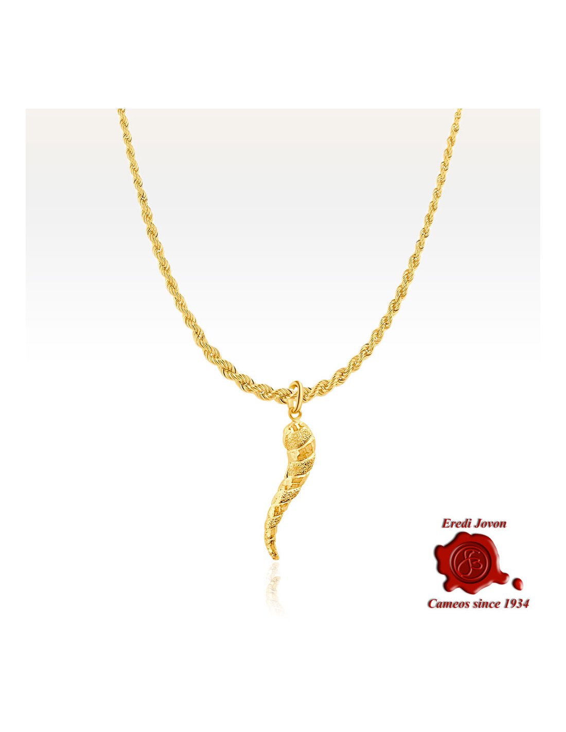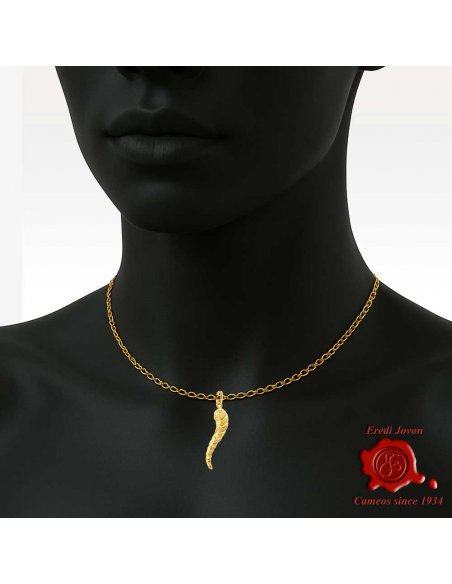 Cornetto in oro giallo 18 kt con lavorazione sabbiata - Un cornetto inusuale e fuori dal comune per un gioiello che parla di te. Questo amuleto è lavorato a mano con la tecnica della sabbiatura (una lavorazione che rende splendente, come la polvere di stelle, la parte che va a impreziosire). E' un gioiello un pochino diverso dal solito e da la l'esatta sensazione di portare ancora più fortuna!