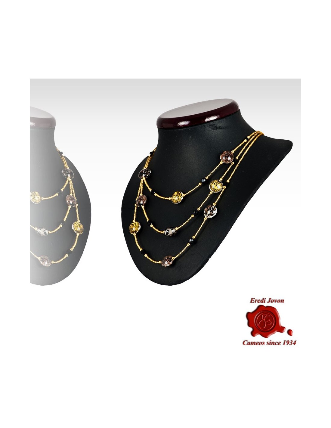 Collana in vetro di Murano a tre fili composta da microperle e 9 perle rotonde al cui interno c’è alternatamente una foglia d’argento mista a polvere d’oro, o una foglia d’oro. La forma schiacciata delle perle grandi fa sì che la collana stia aderente al petto e venga indossata al meglio. Montata in metallo anallergico, disponibile sia nella versione placcata argento che oro.